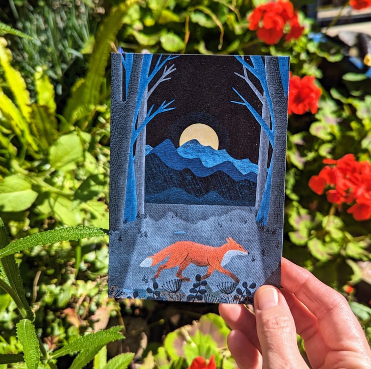 A6 postcard of my digital illustration of a fox running through the woods on a moonlit night.