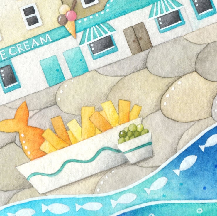 This print features the famous Anstruther Fish Bar in the East Neuk of Fife. A cheeky seagull is eyeing up the fish and chips (and mushy peas!) The fish bar is bustling all year round as tourists flock to try it's famous fish suppers as well as it's homemade ice cream. The best place to enjoy your food is on the beautiful harbour watching the waves and the boats but beware of opportunistic seagulls!