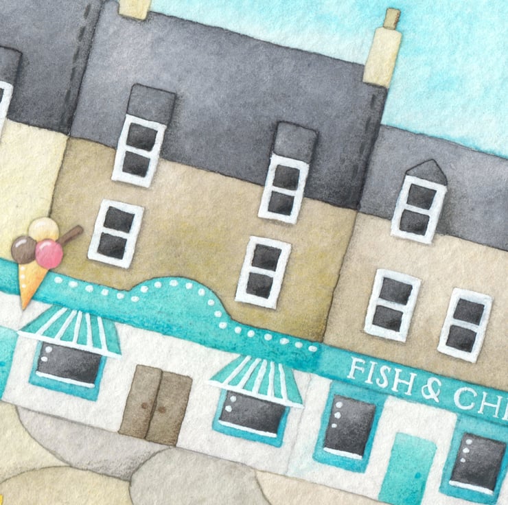 These paintings from the East Neuk of Fife, Scotland feature whimsical watercolour illustrations of some of my favourite places! I've tried to capture the joy of the Scottish seaside, our beautiful beaches and cute, local wildlife. Each print is taken from an original painting using watercolour, ink and coloured pencil.