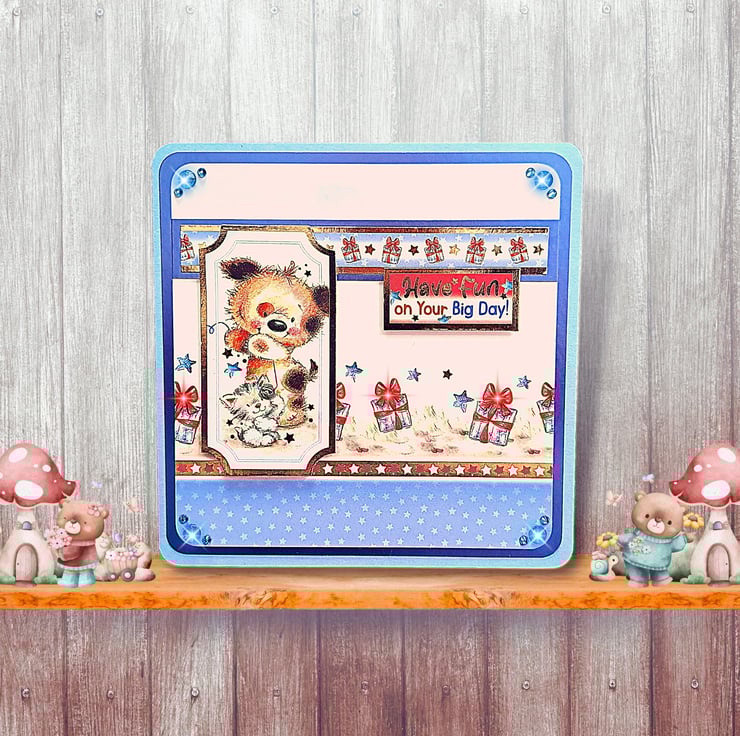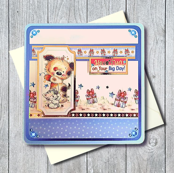 It is decorated with coordinating gold foiled toppers, and the sentiment "Have Fun On Your Big Day". Craft gems decorate the 4 rounded corners of the card, and the bow centres of the parcels. The card is finished with a blank insert, that provides you plenty of space for your messages and wishes.