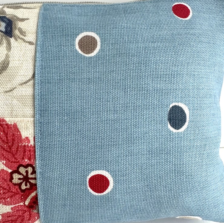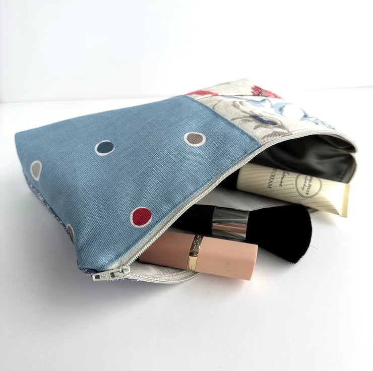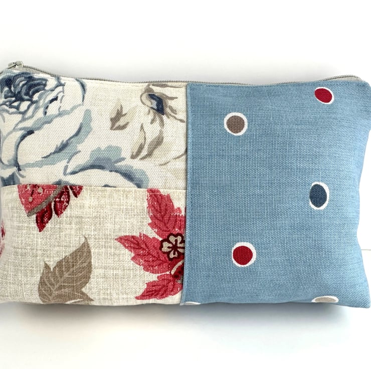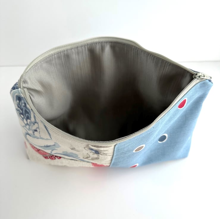 This handy large sized make up bag is made from four print fabrics. The front of the cosmetic bag has three panels which complement each other beautifully. The right half of the front consists of one large panel and the left side consists of two smaller panels. The smaller panels are both floral prints. One features roses in shades of blue and beige on a white background, and the other features leaves and flowers in shades of coral pink, red and beige on a cream background. The larger panel is pale blue and has blue, red, beige and cream polka dots, outlined with white. The back of the bag is made from blue fabric with a pattern of white flecked, criss-crossed lines. The make up bag fastens with a pale grey zip and is lined with grey satin. The base of the bag is boxed giving plenty of room inside.