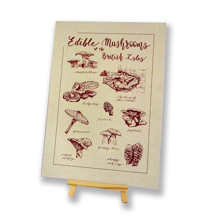 This print features detailed pen and ink illustrations of nine varieties of edible mushroom with a hand-written name label and using a vintage-style colour palette.