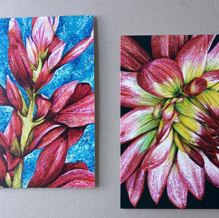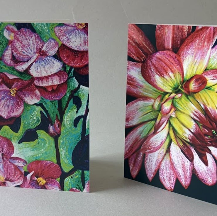 A lovely bright colourful pack of mixed floral greetings cards. These are from paintings I have done of Begonias, Canna Lilies, Dahlias and Lilies. I grow a lot of flowers in my garden, so I always have plenty of inspiration. I was a member of the Society of Floral Painters, until the society closed. I have painted these with a lot of detail. They make great Birthday cards!