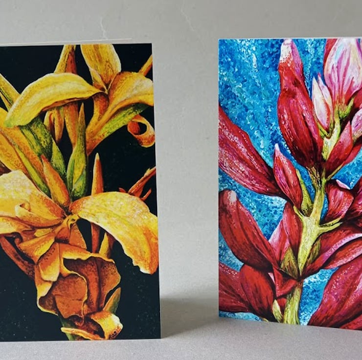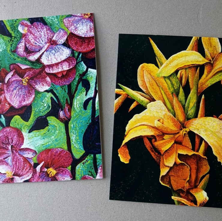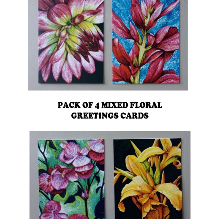 Floral Greetings cards. My own Art. Cards are 5 x 7 ins. There are 4 in each pack, one of each design. Supplied with envelopes. Blank inside for your own message.