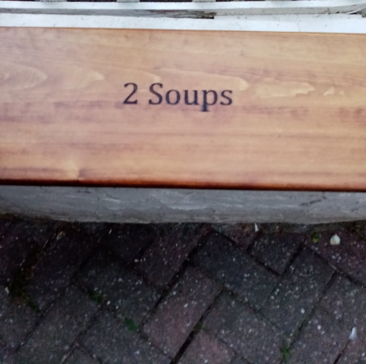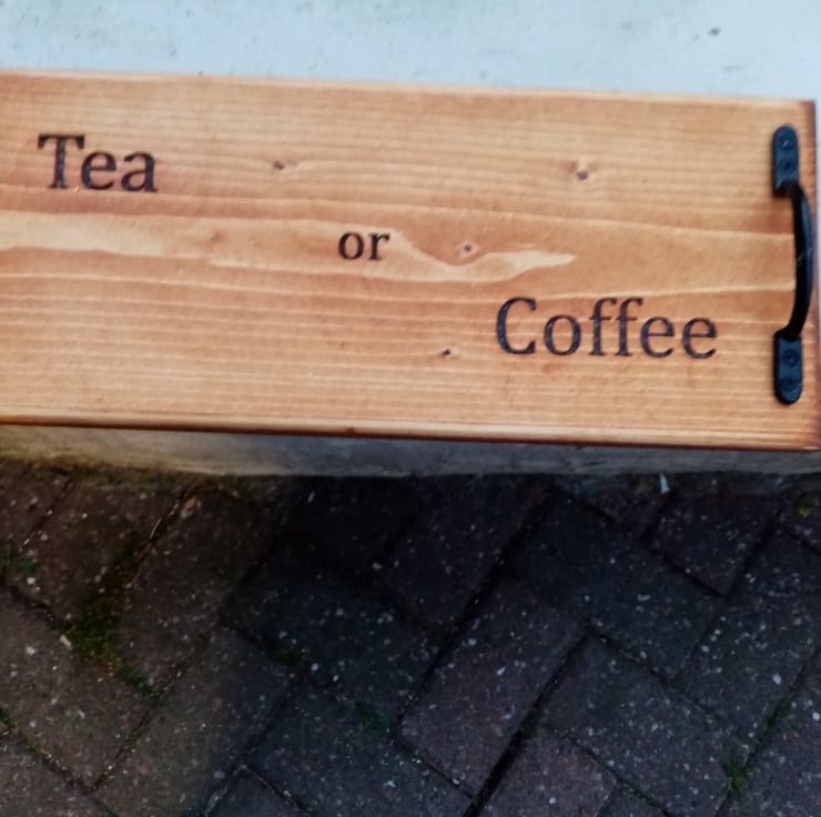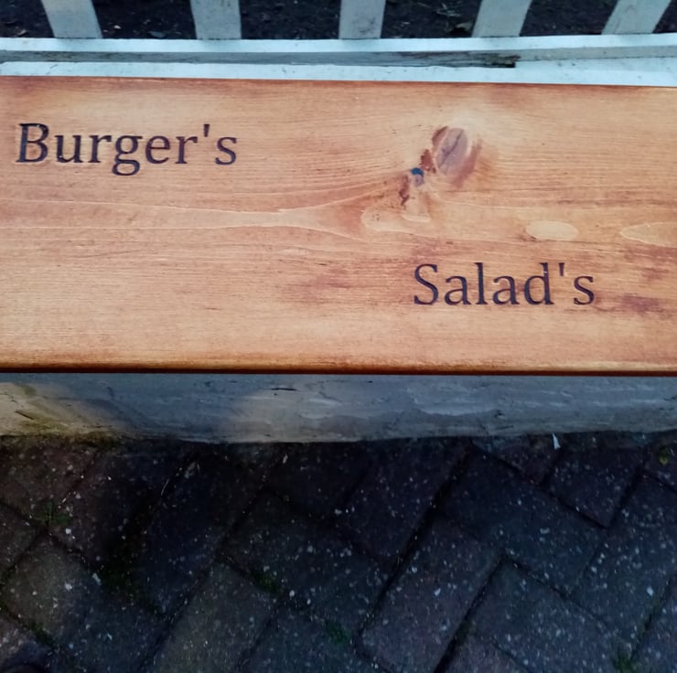Hand-made rustic serving board . 600mm long 215mm wide 30mm thick.your own signage engraved on the board or use the writing displayed. Each board has been finished with food safe oil to enable you to feel at ease serving food .