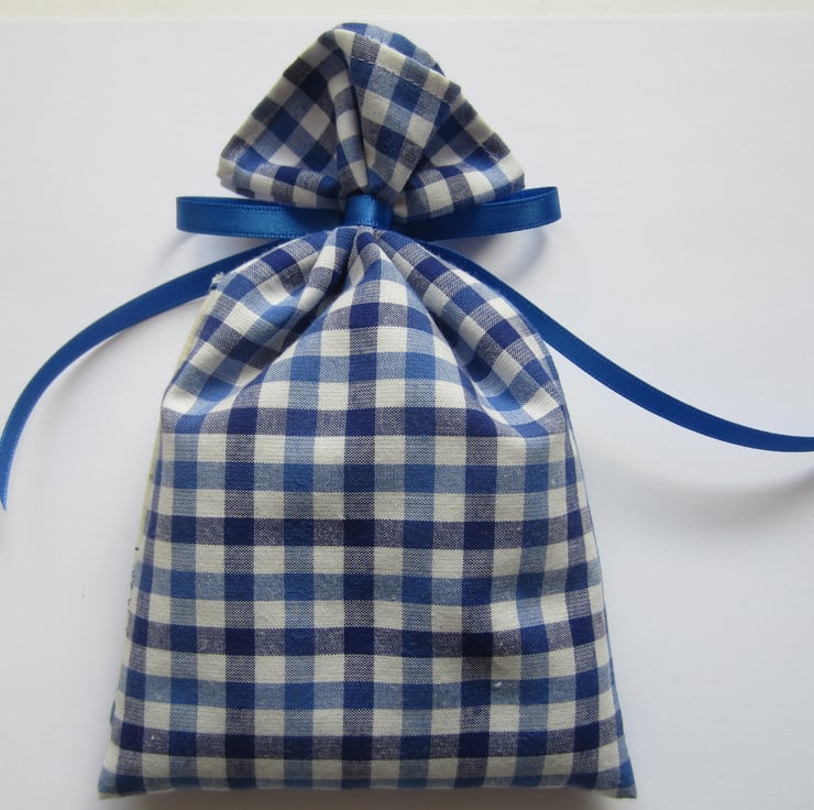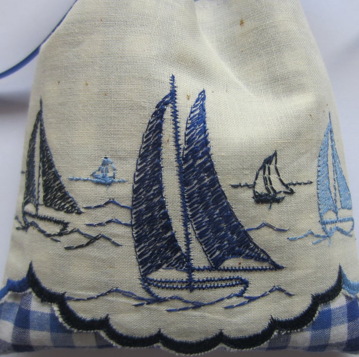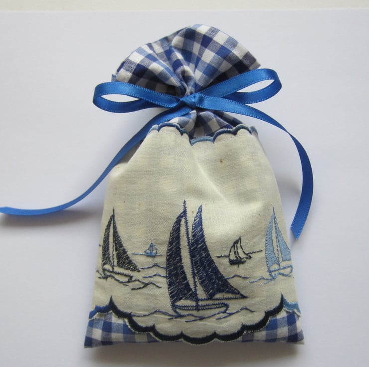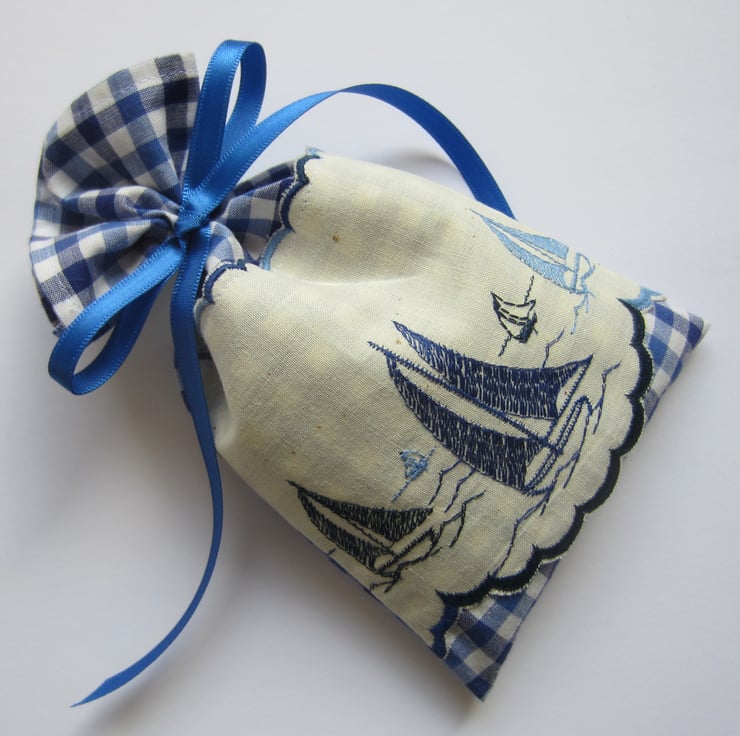 Lavender drawer sachet made from blue gingham fabric and decorated with a vintage embroidered yachts design trim.