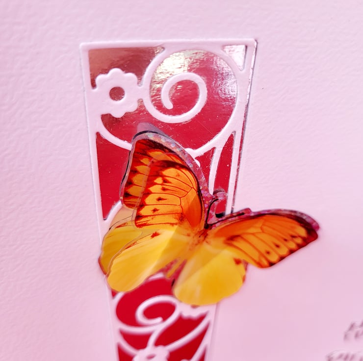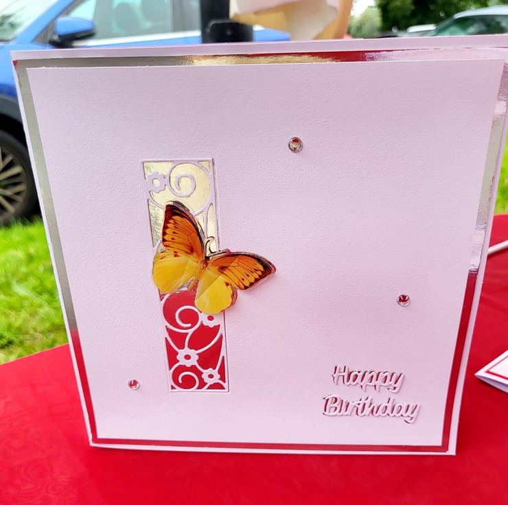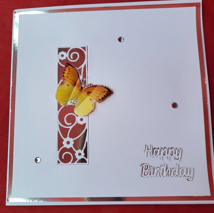A beautiful 8 x 8 inch handmade birthday card which is backed with silver mirror card and has a 3d butterfly sitting on the front. The happy birthday sentiment gaa been diecut on the card front and placed back slightly raised to give an eclipse effect.