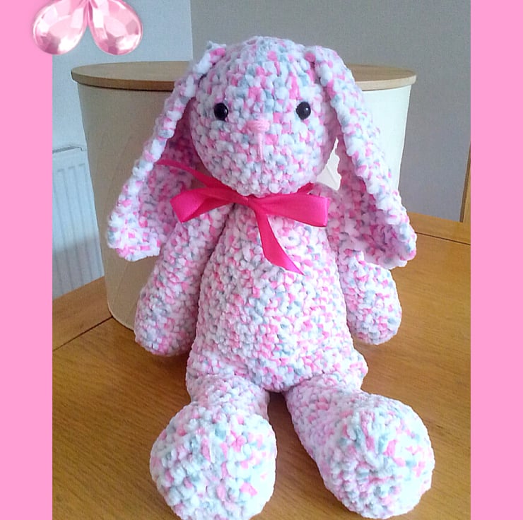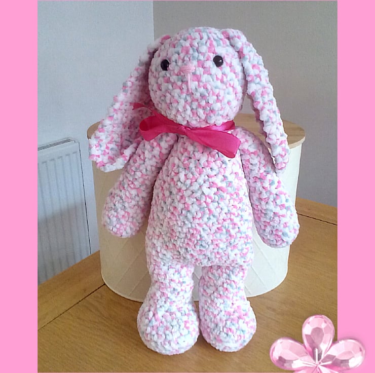 Crocheted bunny made from very soft snuggly yarn. Bunny stands at 18 inches tall. He is stuffed with soft, 100% polyester, washable toy filling, has safety eyes fitted but has not been UKCA tested so is unsuitable for under 14s.