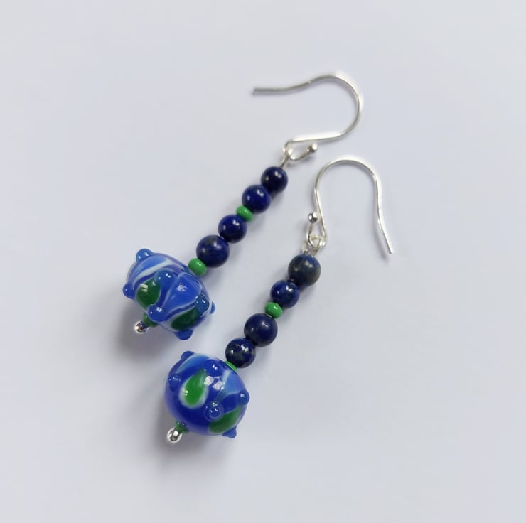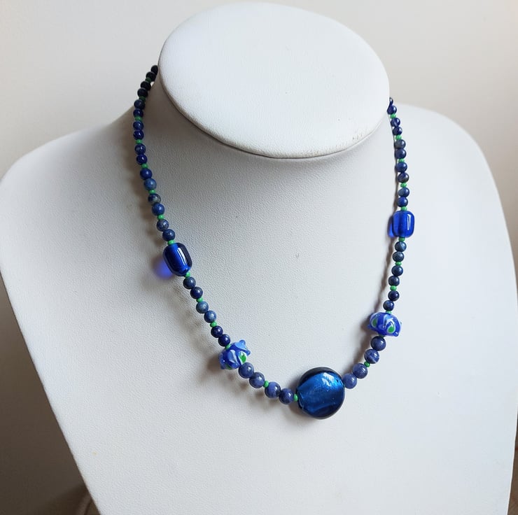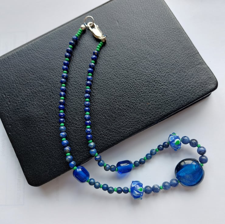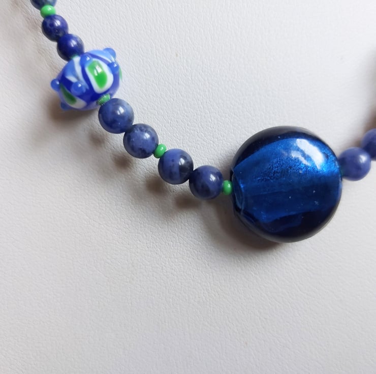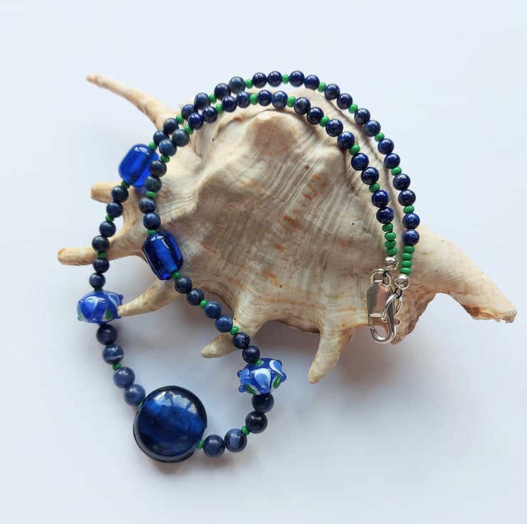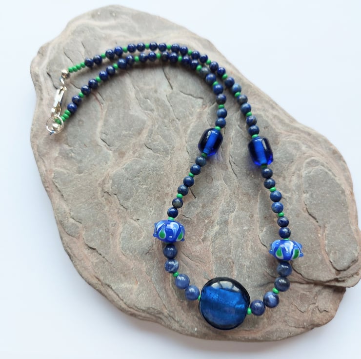 This colourful necklace is a brilliant accessory for any outfits containing royal blue or emerald green. The round blue beads are semi-precious sodalite, separated by green glass seed beads. The larger beads including the round focal bead, are made of blue glass. On either side there are green and blue lampwork beads which have been hand-decorated by a glass artist. The beads are mounted on jeweller's wire and fastened by means of a chunky sterling silver clasp. The total length is 41cm or 16.5inches, which allows it to sit comfortably at the bottom of the neck.