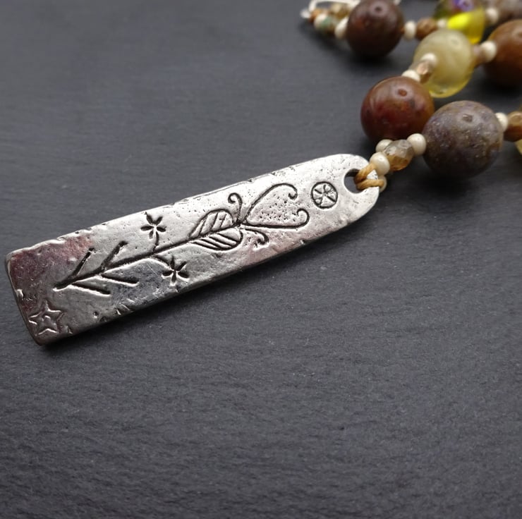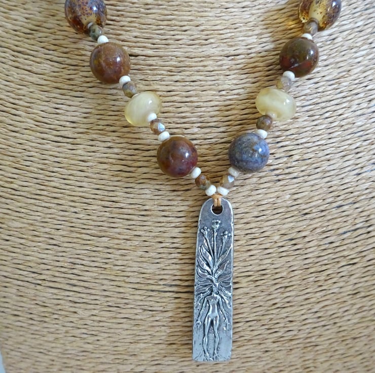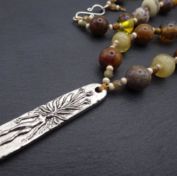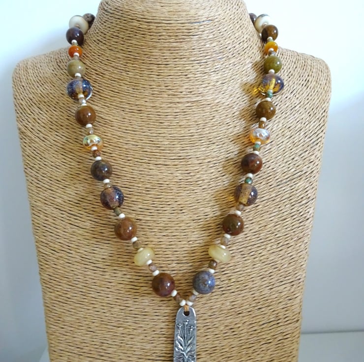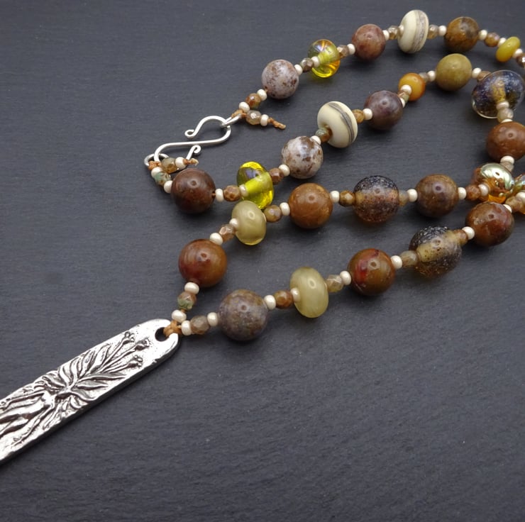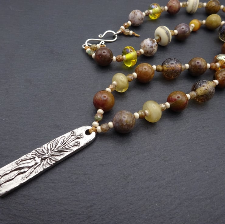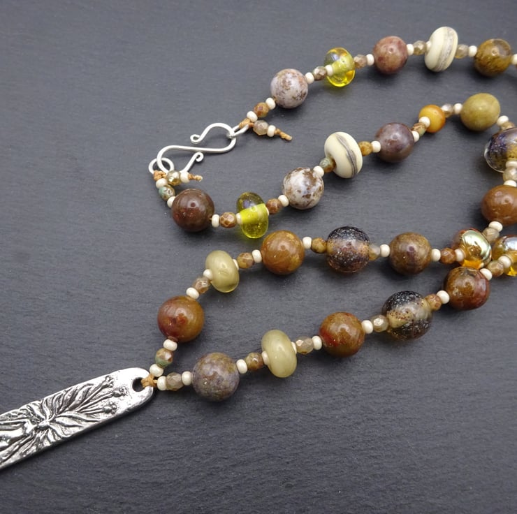 A necklace made with handmade lampwork glass beads, Czech glass beads and jasper gemstone beads.