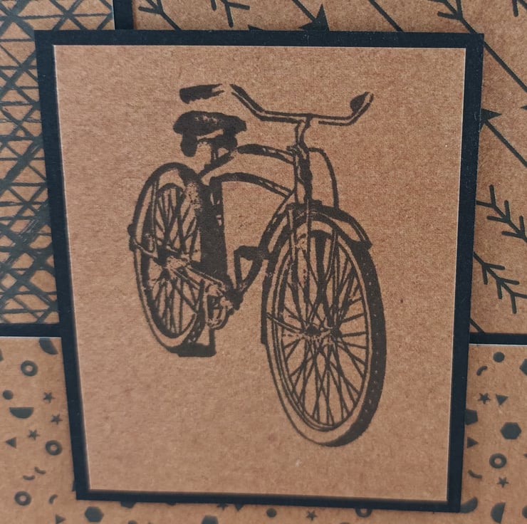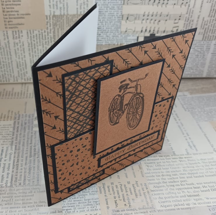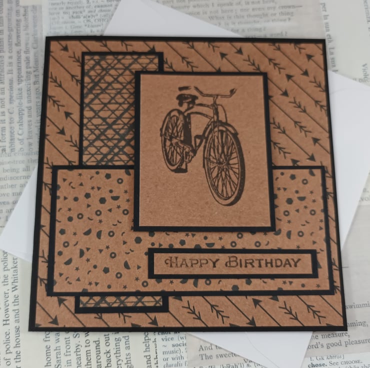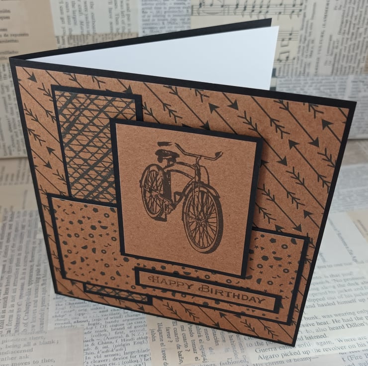 Square birthday card featuring a stamped image of a bicycle on kraft card. This has been mounted onto black card, over a background created from different patterned papers, all black on kraft paper. The sentiment reads: 'Happy Birthday'.