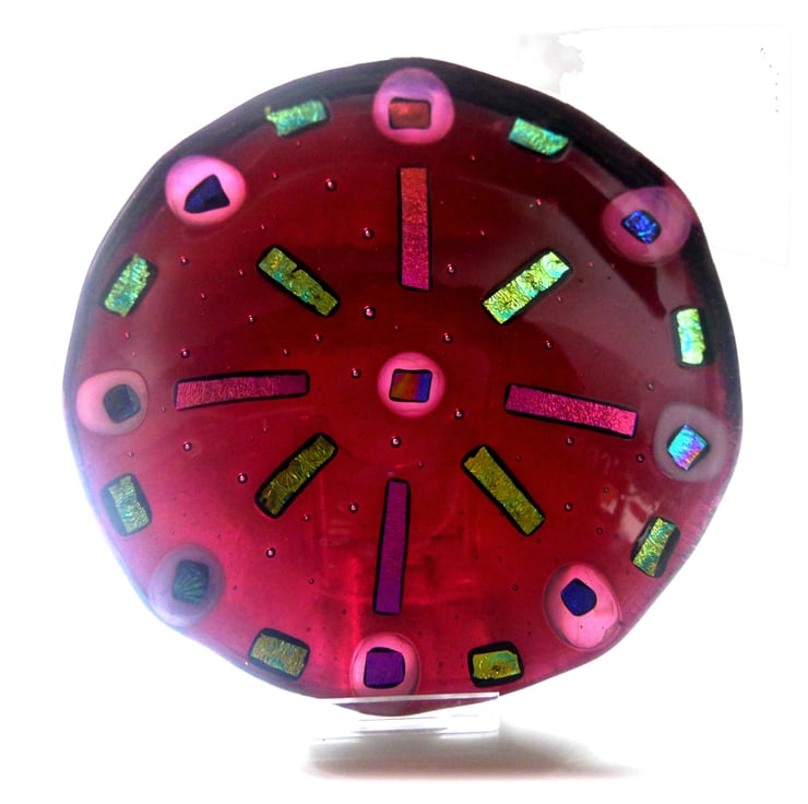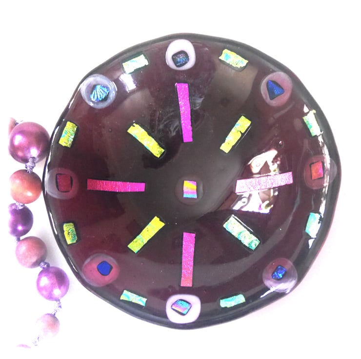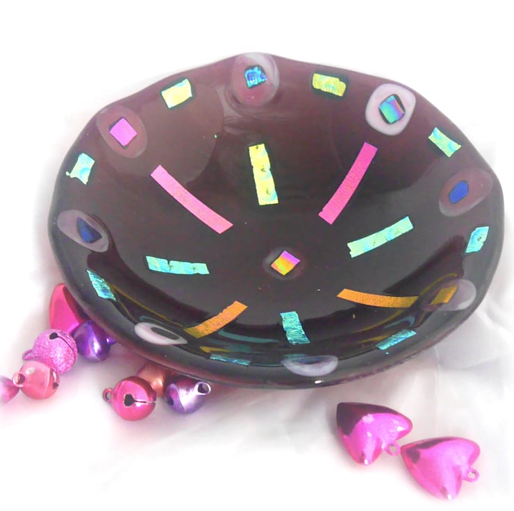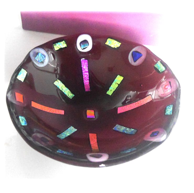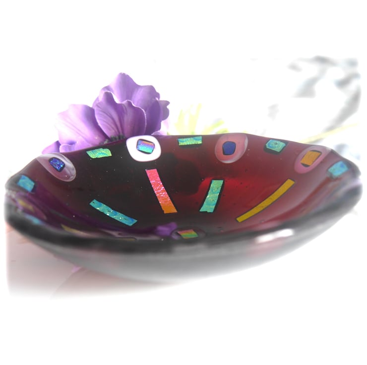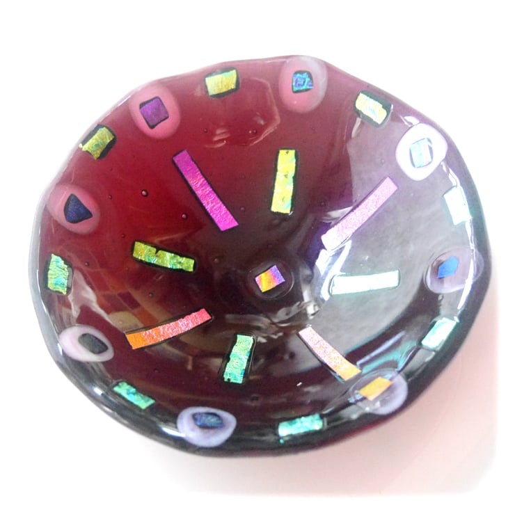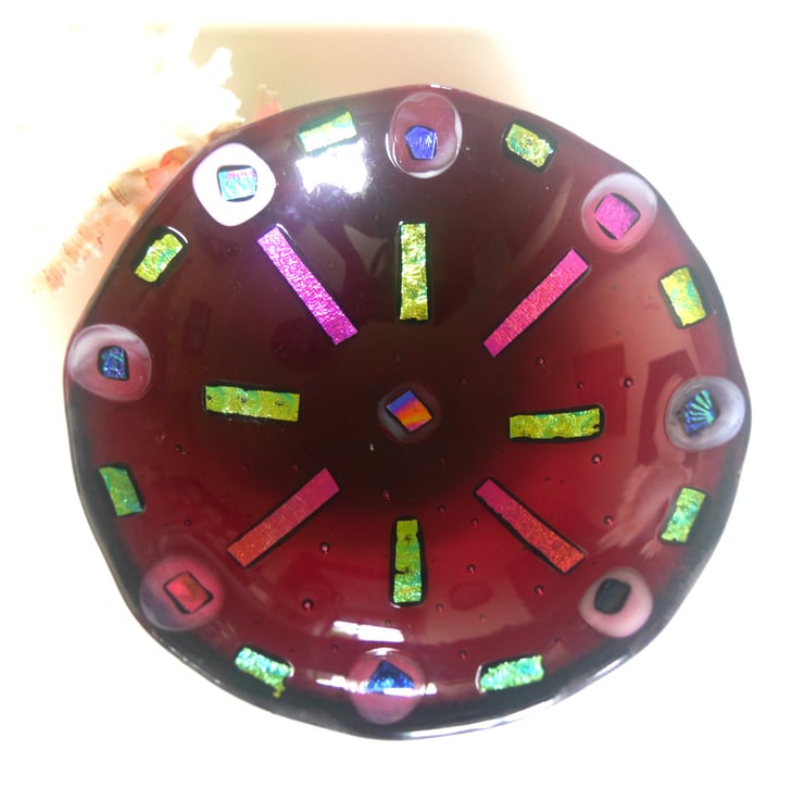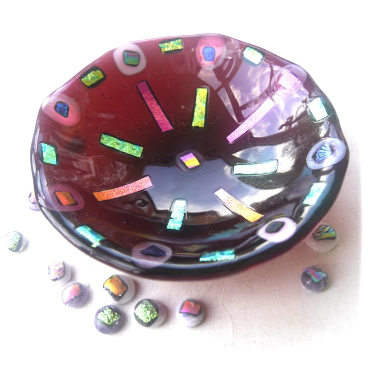 This round dish has a base of clear glass. I've topped it with richly coloured plum, cranberry glass and it is super shiny.