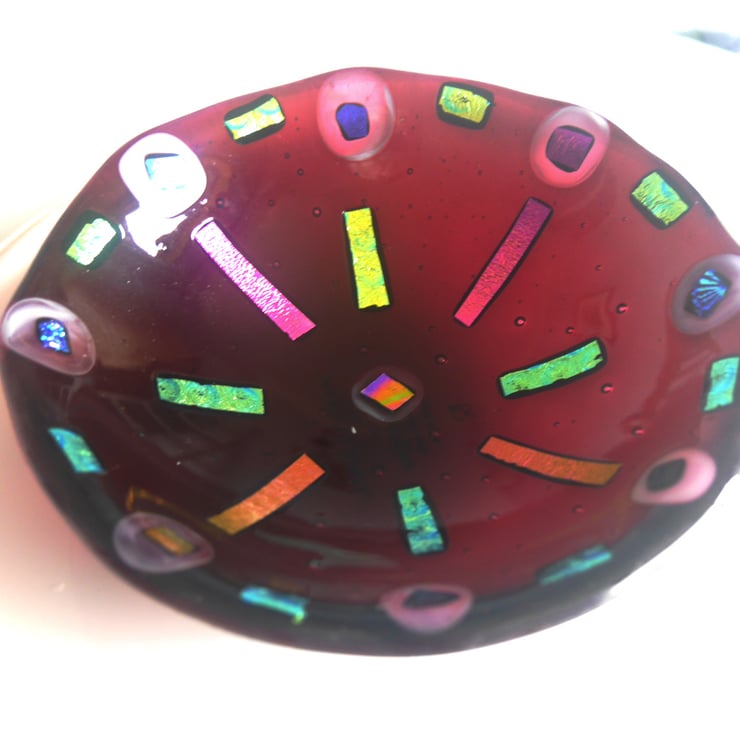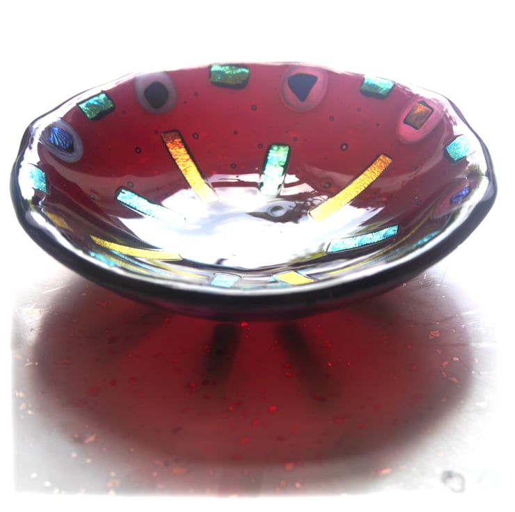 This is fused glass bowl, twice fired to very high temperatures in my kiln, first to fuse all the glass together as a flat circle, 2nd to slump it over a little mold into a dish.