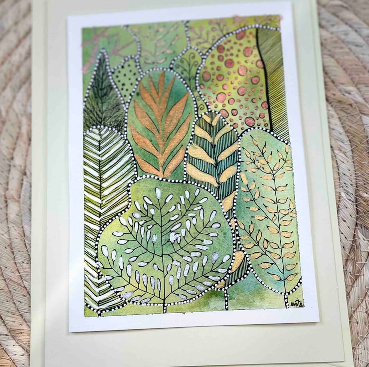 Introducing a beautiful hand painted watercolour greetings card featuring enchanted forest. Painted on a high quality watercolour paper and placed on a pastel coloured card, blank inside.