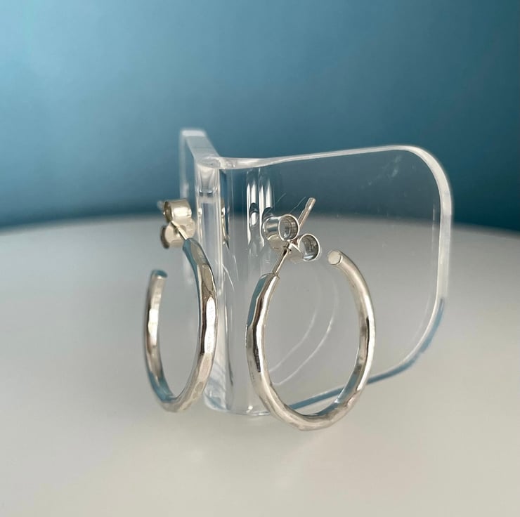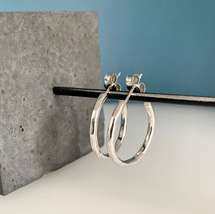 A lovely pair of small classic chunky hoop earrings handmade from 925 sterling silver. Cut by hand from solid 2mm thick silver round wire, formed into circular shapes then hammered to create an attractive faceted textured surface. They have silver pin fittings and are secured with stamped (925) silver scroll’s/butterfly’s.