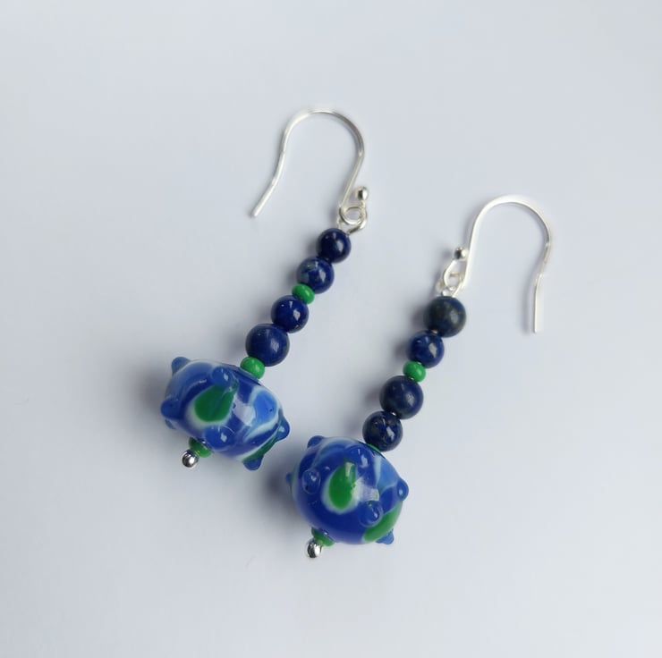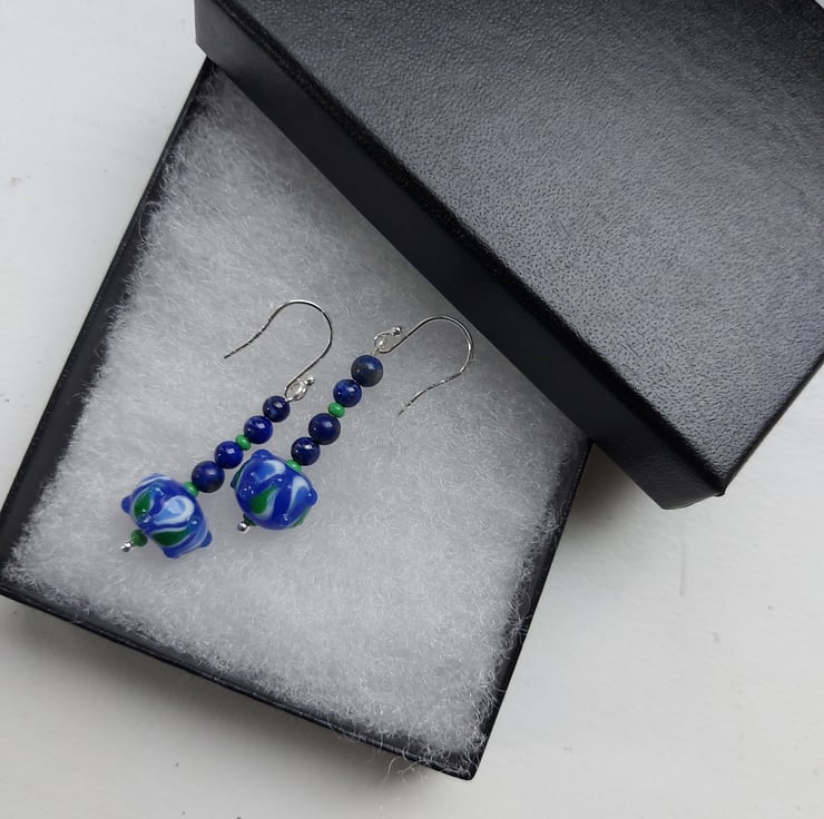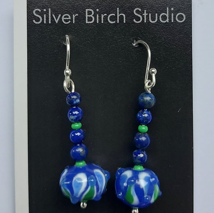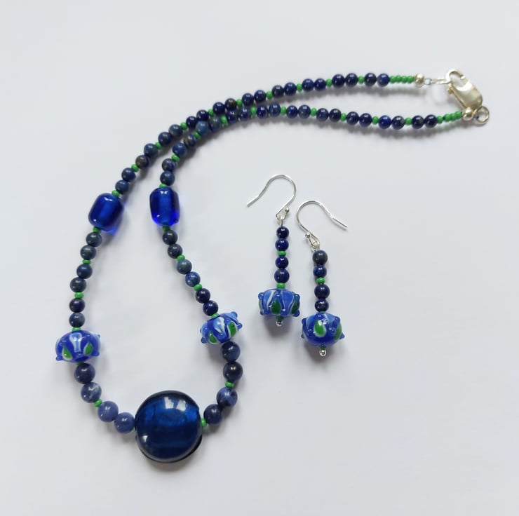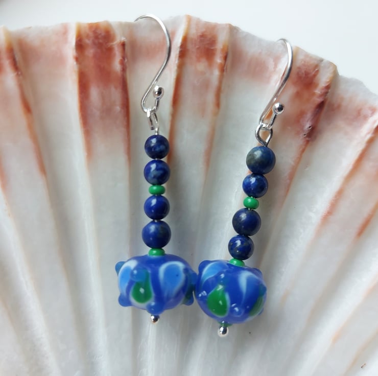 These pretty drop earrings can lift your spirits on a dull day. The round blue beads are semi-precious sodalite gemstones, separated by emerald green glass seed beads. The larger blue, green and white lampwork beads were handmade and decorated by a glass artist. The beads are mounted on sterling silver headpins and the ear hooks are also sterling silver. The drop below the hook is 3.5cm or 1.5inches. The earrings can be bought on their own or together with a matching necklace, also listed in my Folksy shop and shown in the last photograph. If you buy them together as a Jewellery Set, a 10% discount will be applied and you will only pay a single postage charge.