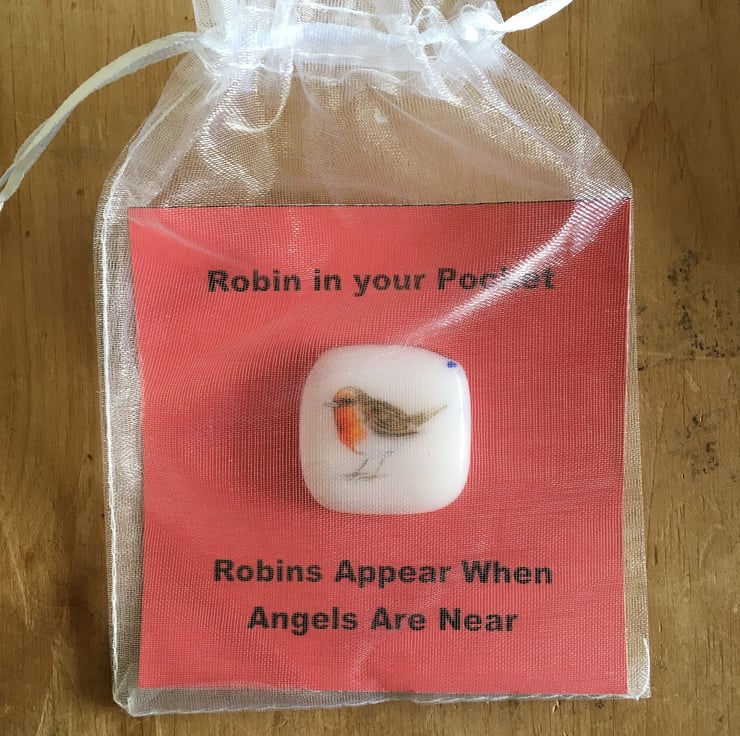 The handmade charm is a token or gift to a loved one or for yourself. The robin charm is very tactile and measures up about 25mm x 25m (Shape and size may slightly vary due to the glass fusing technique). The five pence coin shows the actual size. My inspiration was from a visiting robin in my garden and a quote " When a robin constantly visits you or crosses your path, it's a loved one in heaven saying, Hello". The robin (ONE)comes attached to a card in an organza bag. You can choose between the quotes, Robins appear when angels are near or Robins appear when a loved one is near . If you would prefer another quote just message me. Sometimes the shading of the Robin may vary due to the firing of the glass in the kiln. I also sell a little Robin on a key ring, have a look