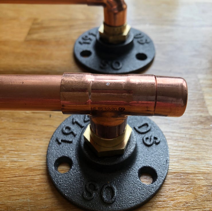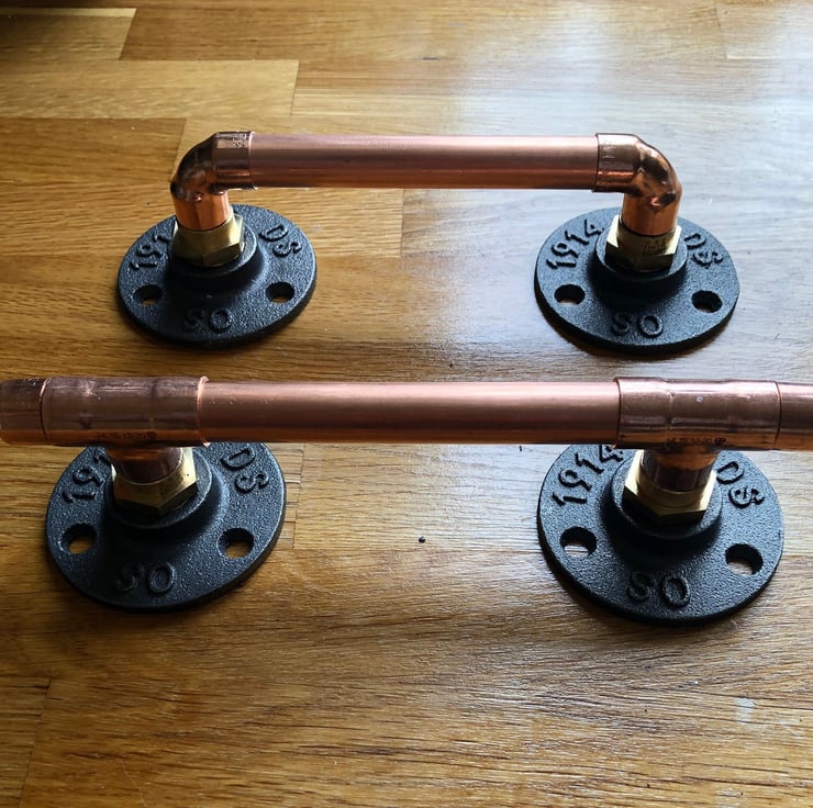 The copper pipe handles are the perfect way to add a contemporary industrial look to your cupboards drawers. They can also be used on anything else you have in mind.Each handle has been crafted from strong 15 mm copper pipe & copper fittings. The pipe is secured to two black cast iron end plates (flanges), via two brass couplings.