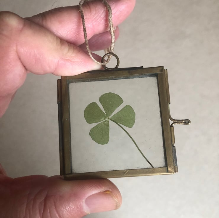 Beautiful real pressed four-leaf clovers are encased inside a glass frame and the four-leaf clovers will keep forever.