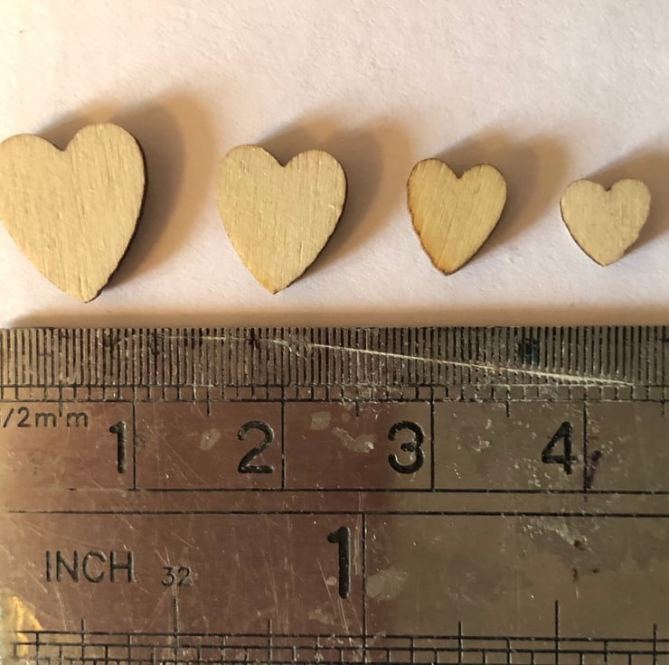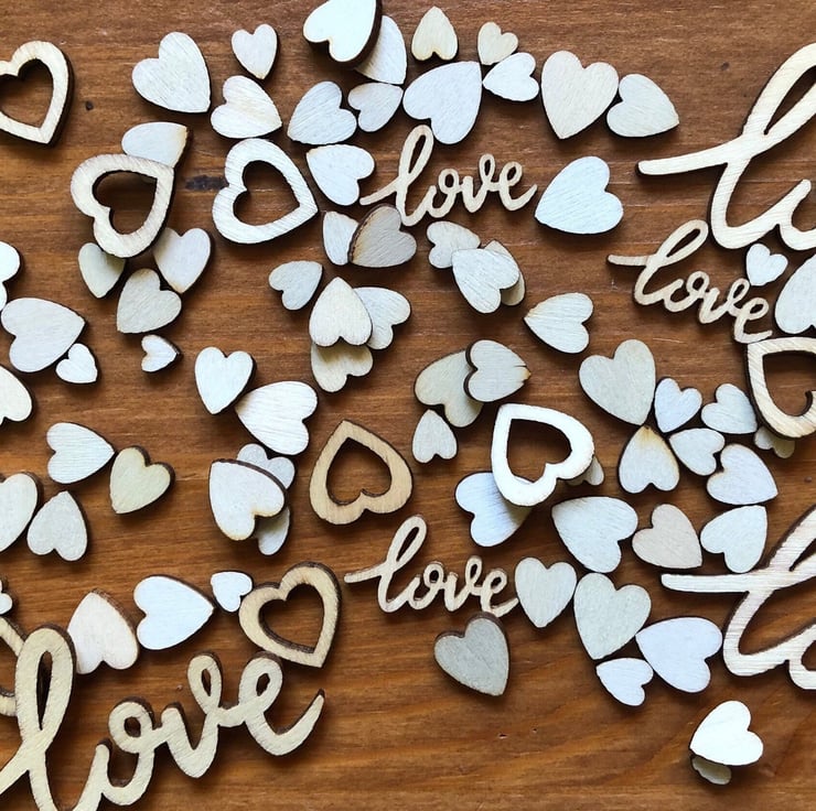 A mixed bag of wooden confetti. Comes in bags of 5, 25, 50, 100, 200 wooden laser cut table confetti. The sizes of the confetti is from 3 mm (hearts) to 60 mm (Love ).