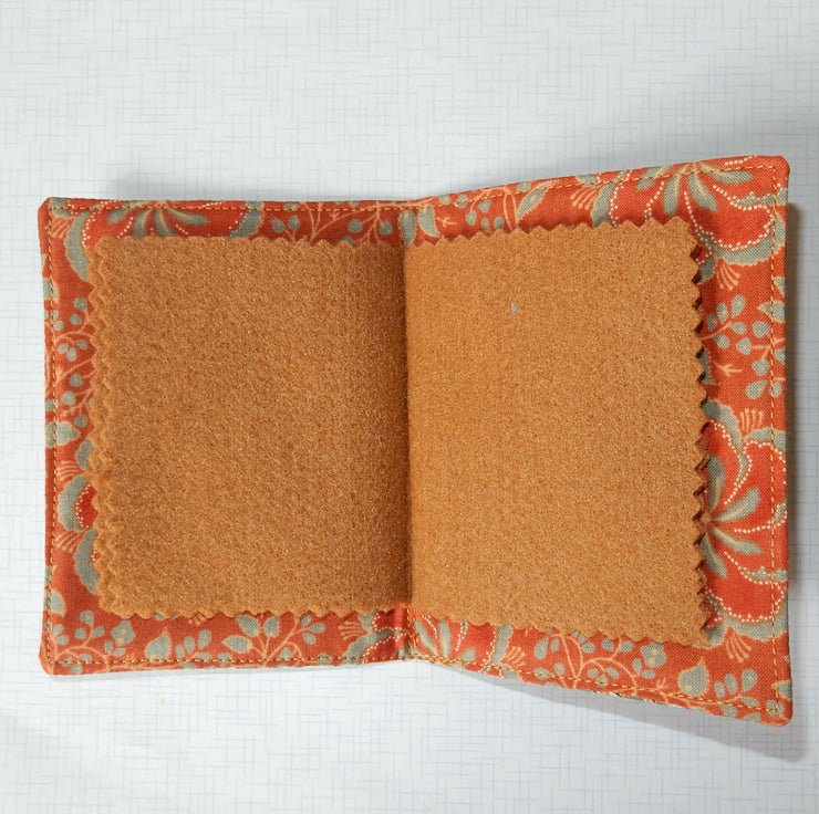 Are you a keen caravanner, or know someone who is? This needle case features a caravan in the woods, behind a dry stone wall. It is made from cotton fabrics with the caravan appliqued on. The case measures approx. 4.5 x 3 inches , and it is lined in toning cotton fabric and it has four felt leaves for your pins and needles.