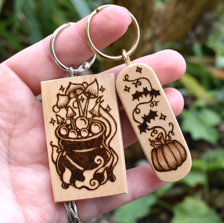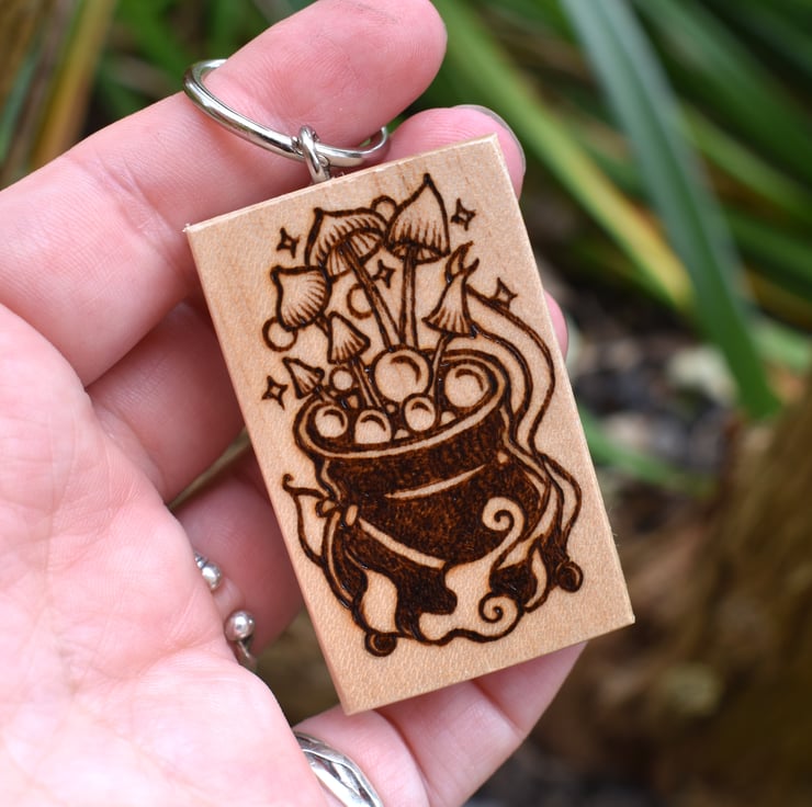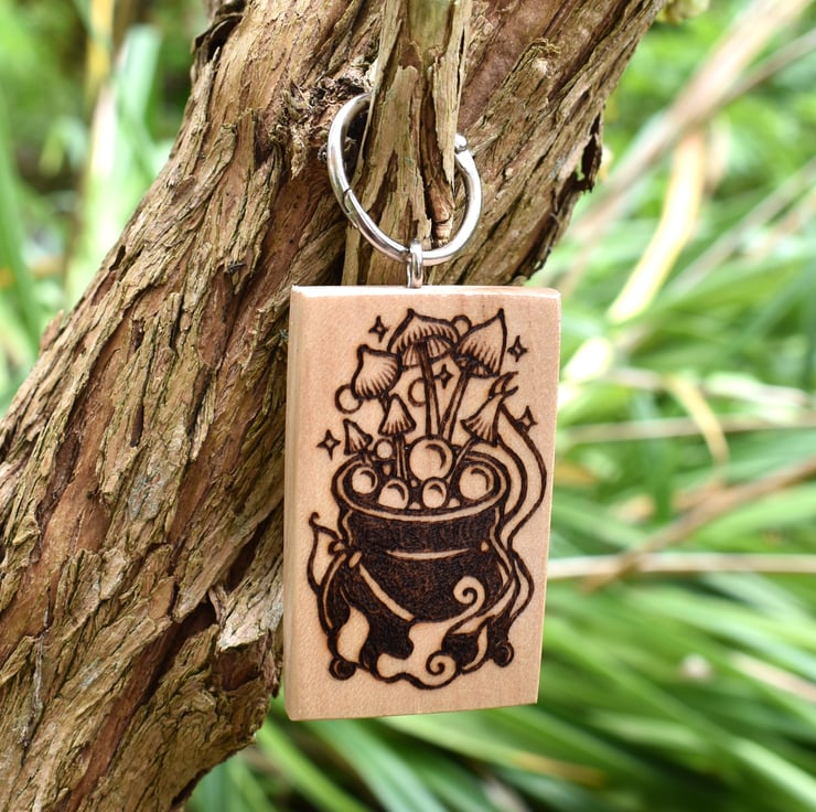 A chunky keyring burned using pyrography with a cauldron design -with added fungi of course!