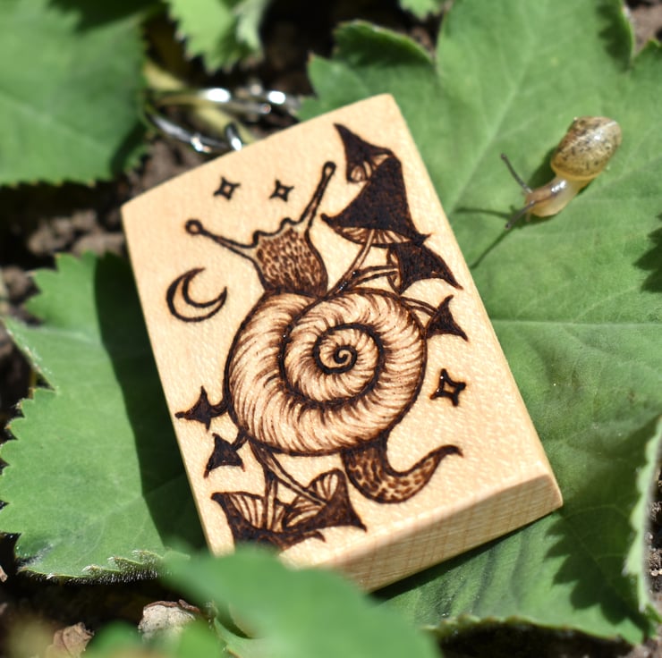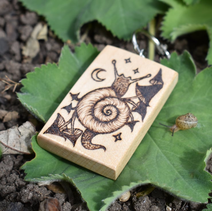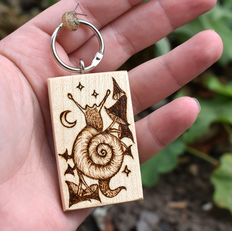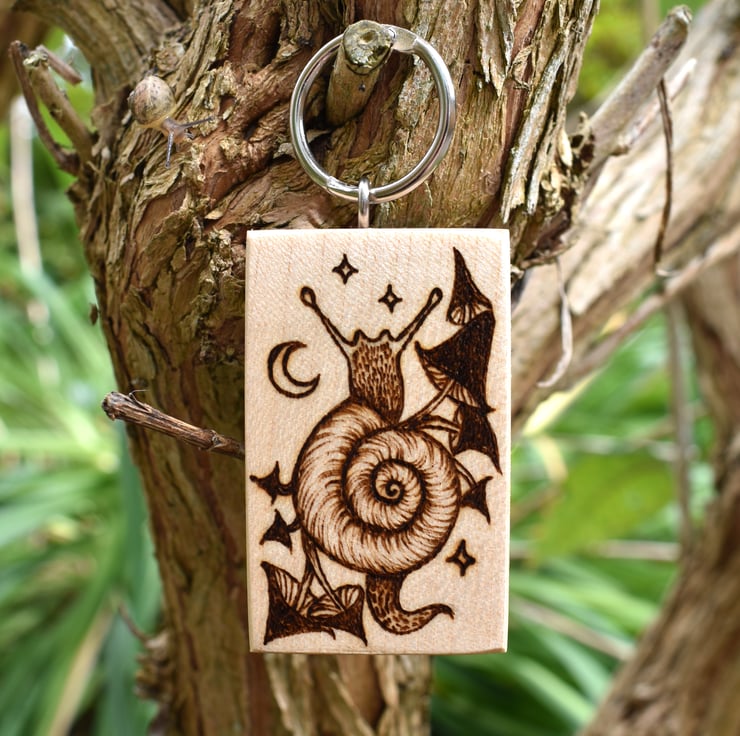 A chunky keyring burned using pyrography with a snail, crescent moon and witchy fungi.