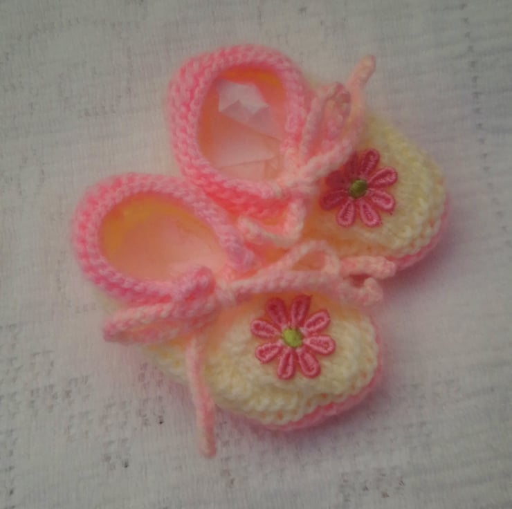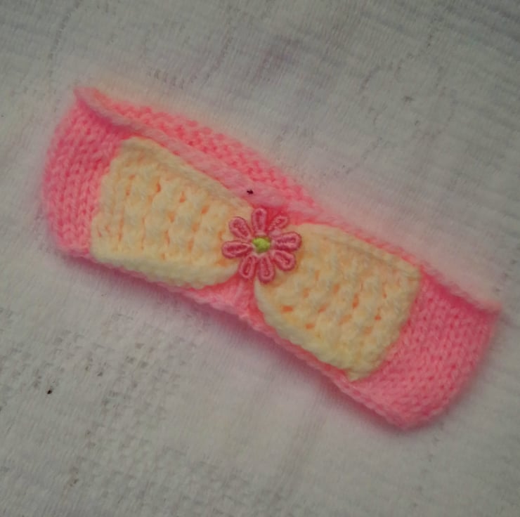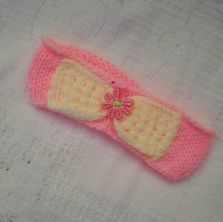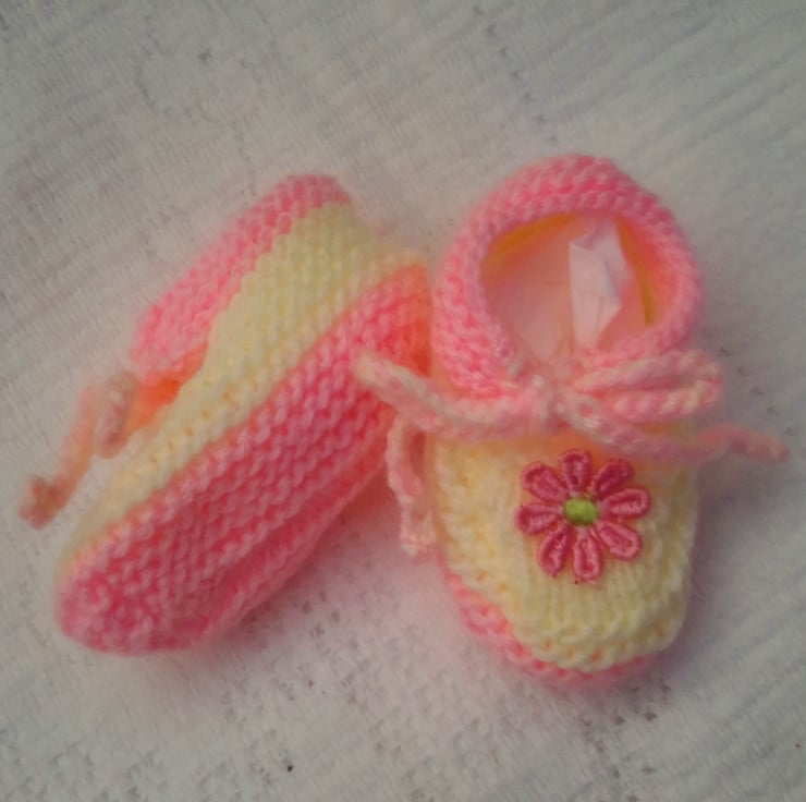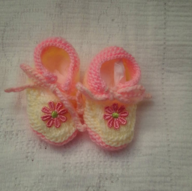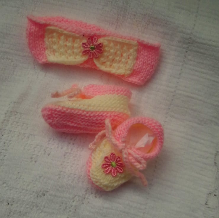 Cute baby's gift set including headband and shoes hand knitted in double knitting yarn. It would make an ideal Christening gift, new baby gift or baby shower gift, or or your own little baby girl.