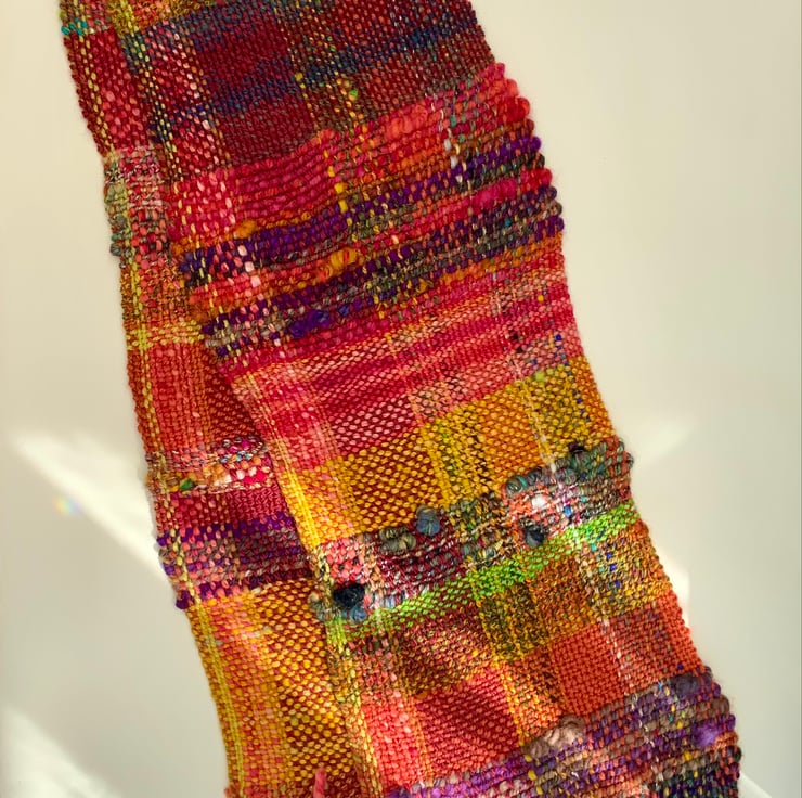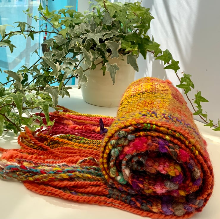 A scarf/shawl from the “scrappy scarf/shawl winter collection 2023” - featuring scarves/shawls made from art yarn that I have dyed and spun myself, and then woven.
