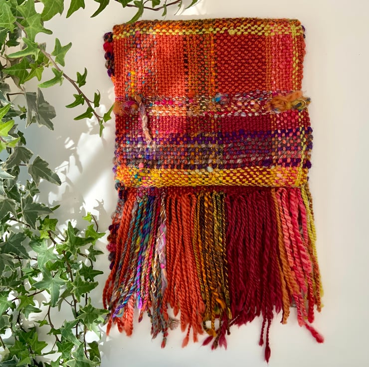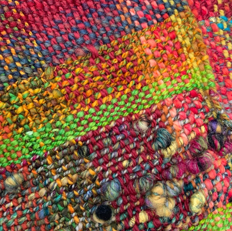Hand spun and hand woven with hand dyed Corriedale, Shetland, sari silk, hand dyed merino, hand dyed exmoor horn, wool locks,angelina, and gold thread. There are added features to this woven scarf, it isn’t just plain weave, as there are bumps, bobbles and tassels, and course and fine wools have been used for added texture. It is a OOAK art work in itself!