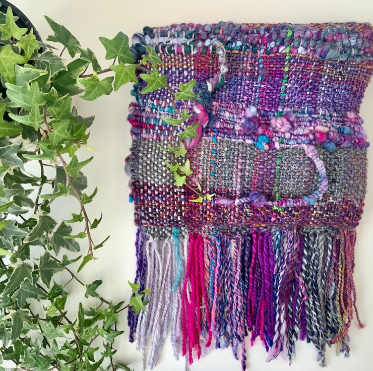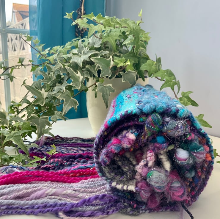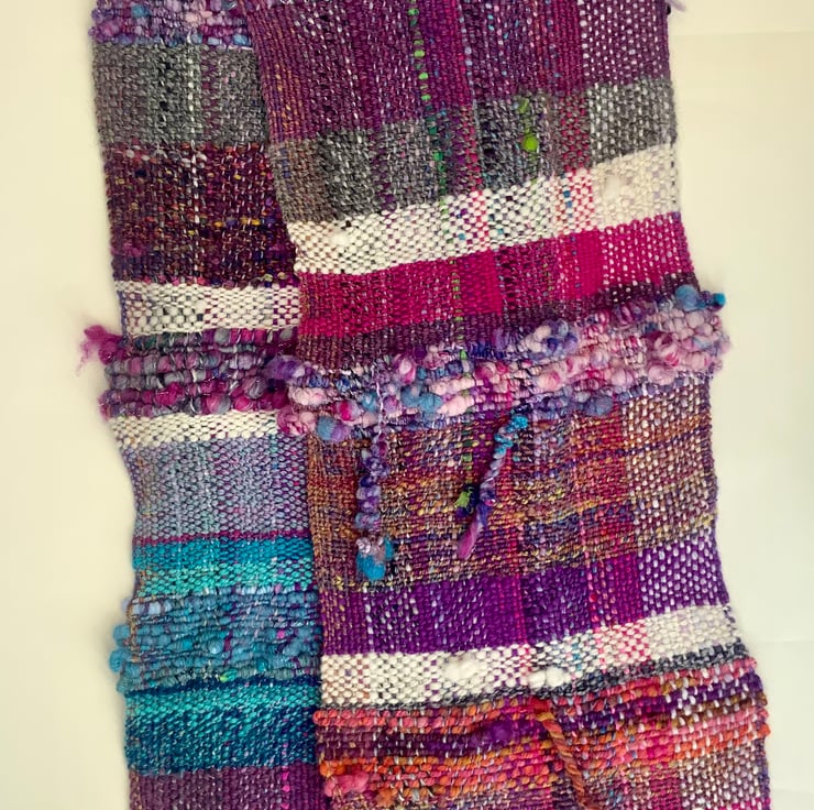 Hand spun and hand woven with Corriedale, Shetland, sari silk, sari ribbon, hand dyed merino, wool locks, hand dyed exmoor horn, Angelina, silk and alpaca. It also has British wool that I have processed myself, from the sheep’s fleece: scouring,washing, picking, spinning and dyeing.There are added features to this woven scarf, it isn’t just plain weave, as there are bumps, bobbles and tassels, and course and fine wools have been used for added texture. It is a OOAK art work in itself!
