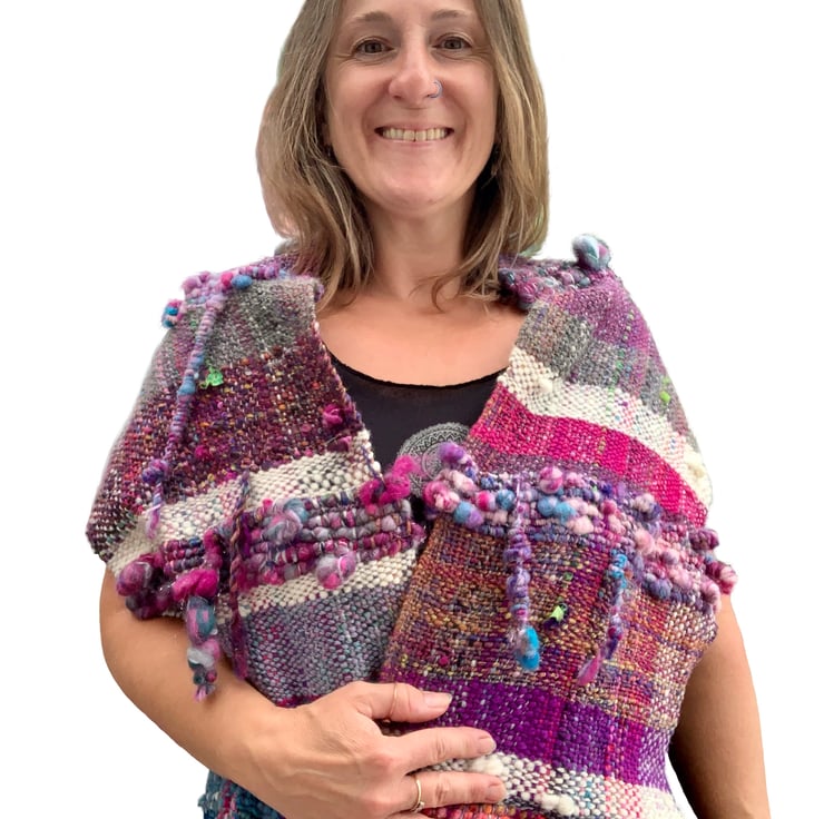 A scarf/shawl from the “scrappy scarf/shawl winter collection 2023” - featuring scarves/shawls made from art yarn that I have dyed and spun myself, and then woven.