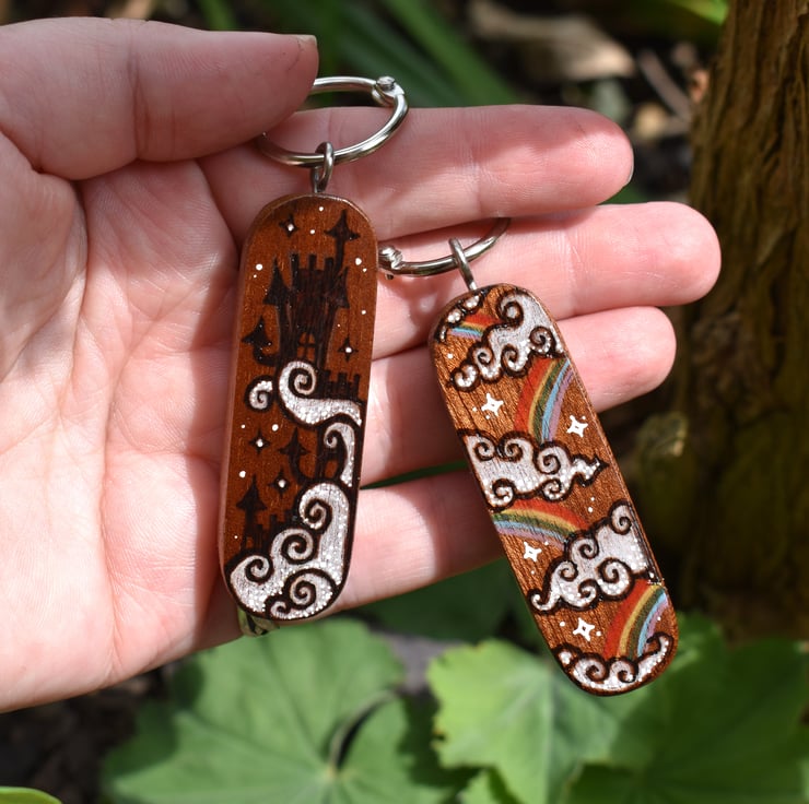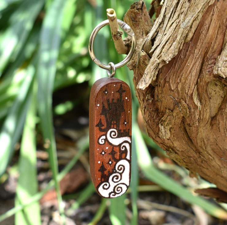 A spooky castle in the clouds is the design on this sapele wood keyring, hand burned using pyrography and coloured with art pencils.