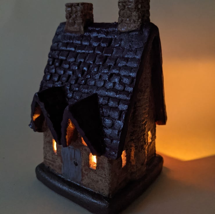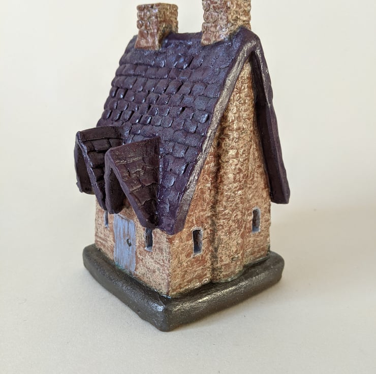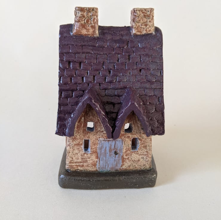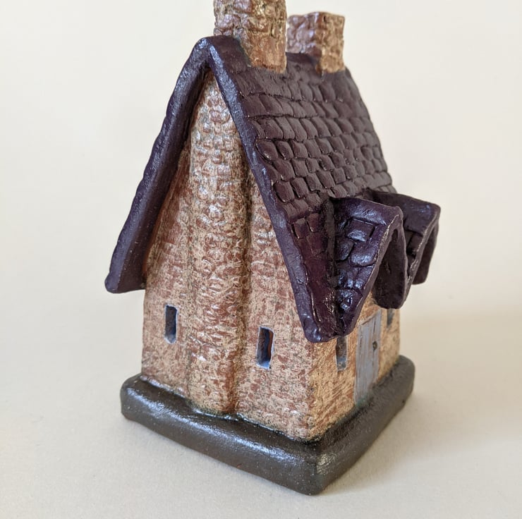 Welsh Slate Roof Style Cottage Tealight Holder. All items are made from scratch. I draw and plan each building then cut the pieces out of clay. I add textures and details then build them. Once they are assembled I decorate them with coloured clays and oxides before the bisque firing then they are glazed and fired once more. Every little building is unique.