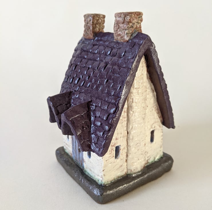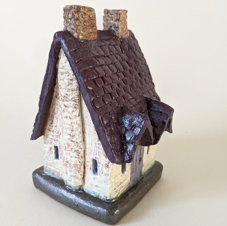 Welsh Slate Style Roof Cottage Tealight Holder. All items are made from scratch. I draw and plan each building then cut the pieces out of clay. I add textures and details then build them. Once they are assembled I decorate them with coloured clays and oxides before the bisque firing then they are glazed and fired once more. Every little building is unique.