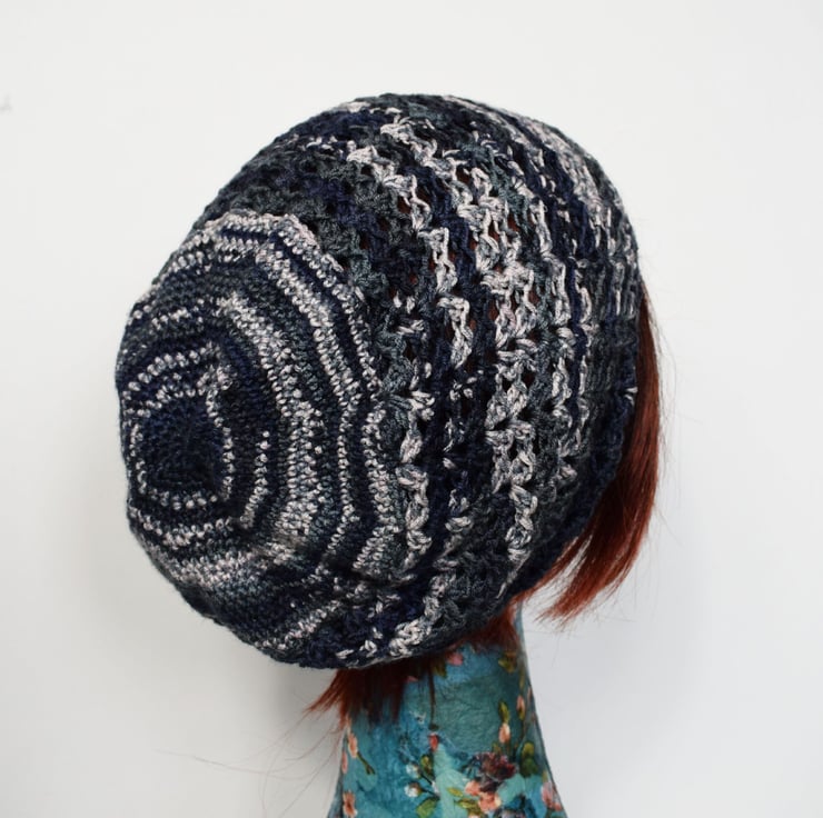 If you're looking for a non wool hat but would rather not wear acrylic then how about this lovely crochet beanie made in a soft bamboo yarn in shades of black, grey, blue and stone. The yarn is 75% bamboo and 25% nylon and has a silky finish, really soft and comfortable to wear especially if you have sensitivity issues.