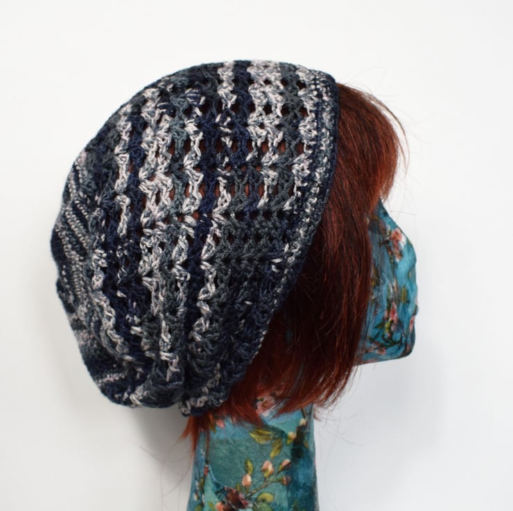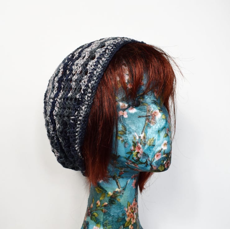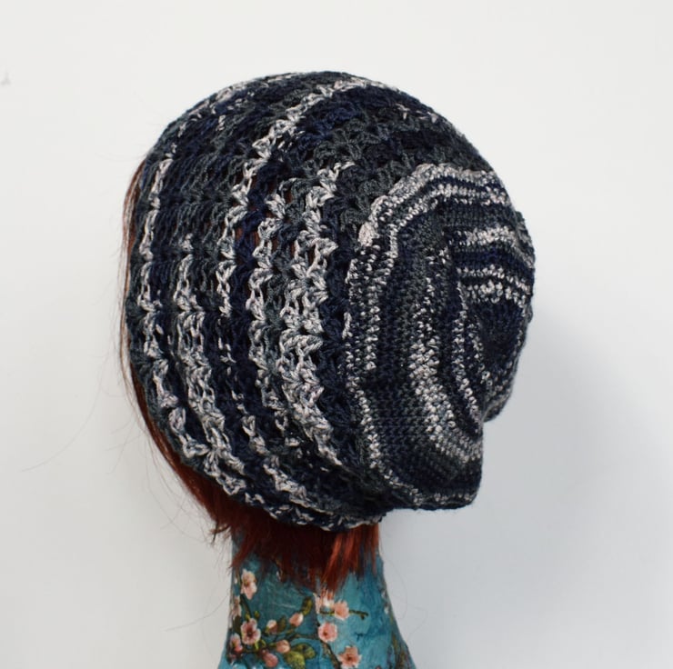 If you're looking for a non wool hat but would rather not wear acrylic then how about this lovely crochet beanie made in a soft bamboo yarn in shades of black, grey, blue and stone. The yarn is 75% bamboo and 25% nylon and has a silky finish, really soft and comfortable to wear especially if you have sensitivity issues.