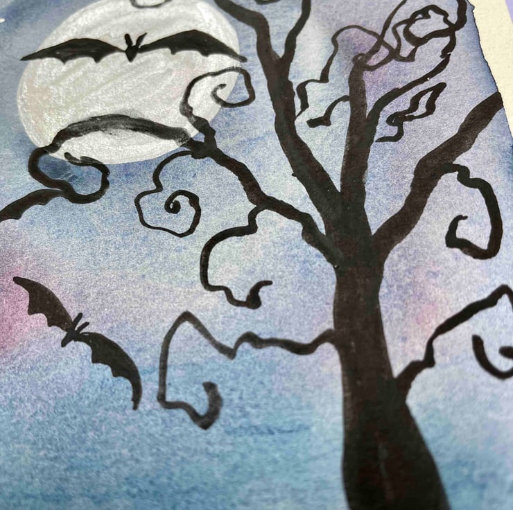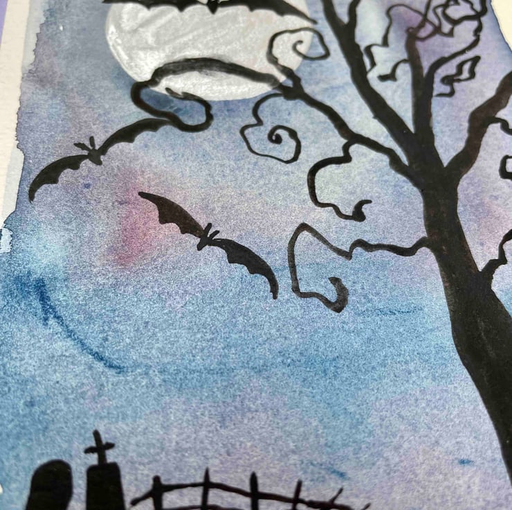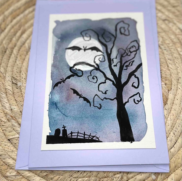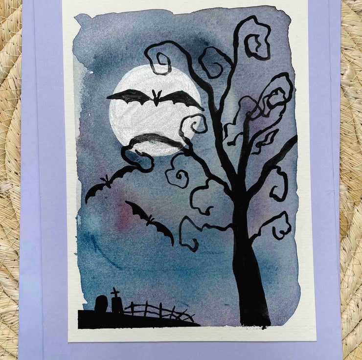 Introducing a beautiful hand painted watercolour greetings card featuring scary, crooked, whimsical tree, full moon, bats and a graveyard - prefect for all your Halloween greetings. Painted on a high quality watercolour paper and placed on a pastel coloured card, blank inside.