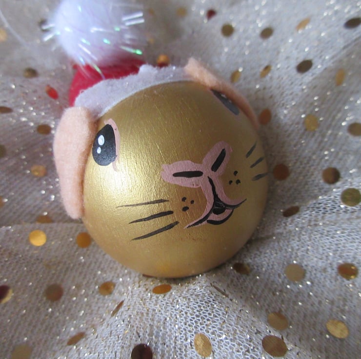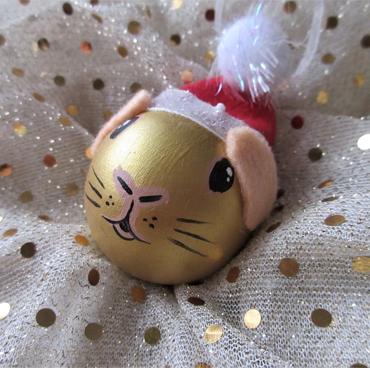 The 4cm diameter wooden craft ball is painted to represent a guinea pig, in a lovely gold shade.. The guinea pig wears a hand crafted mini Santa hat, which has a length of ribbon attached for hanging the decoration by.