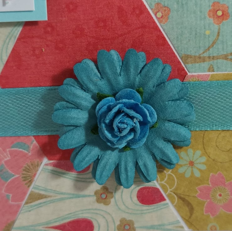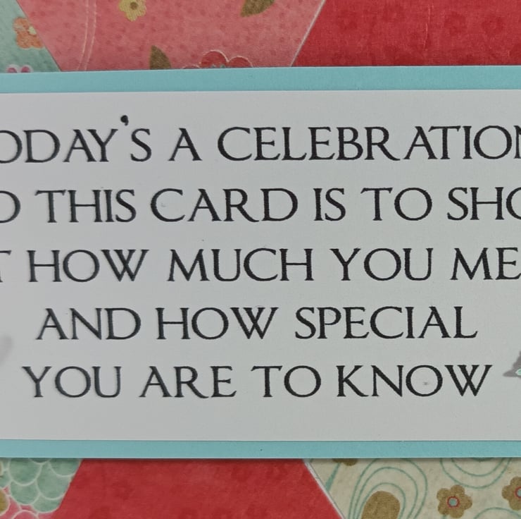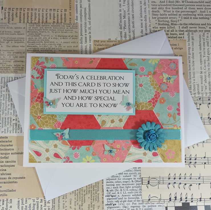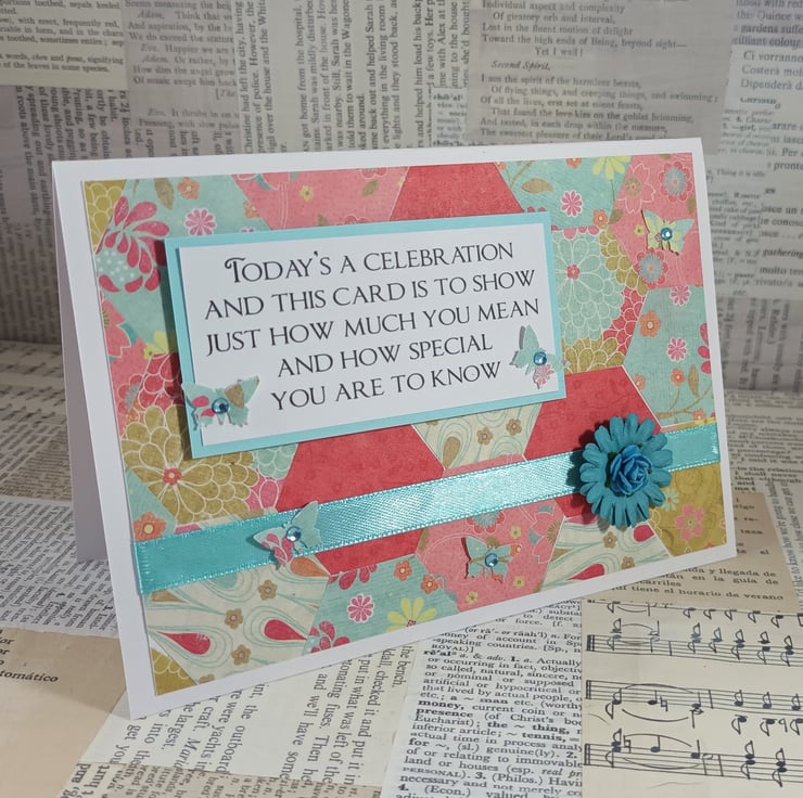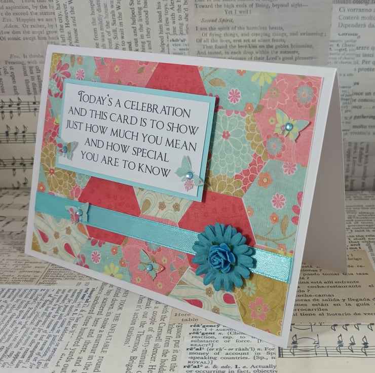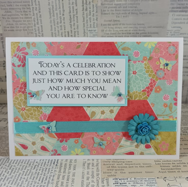 The verse has been mounted onto pale blue card and overlaid onto a background created from hexagons of patterned paper. The card has been further embellished with small butterflies with adhesive gem centres, ribbon and a paper flower.