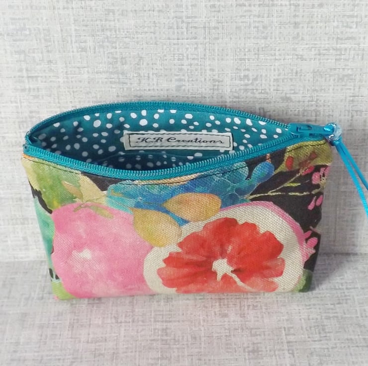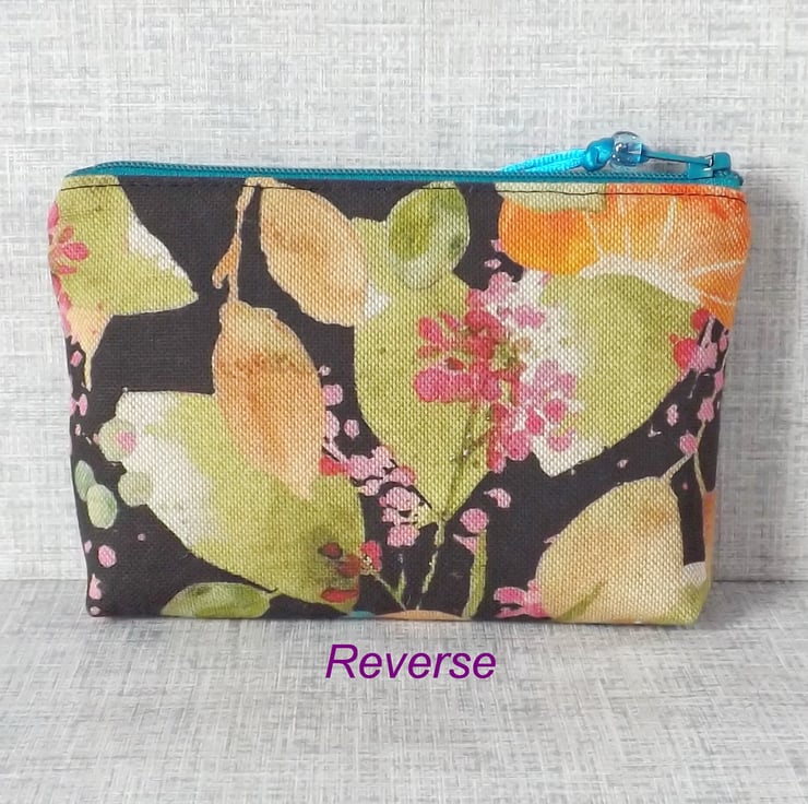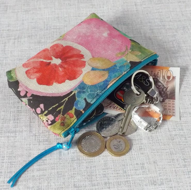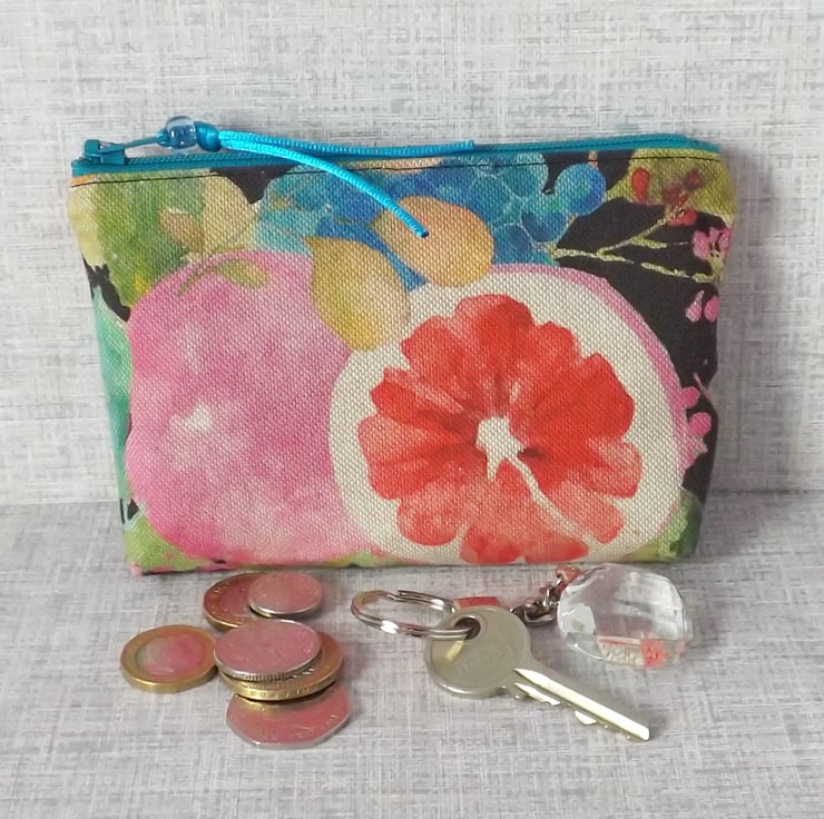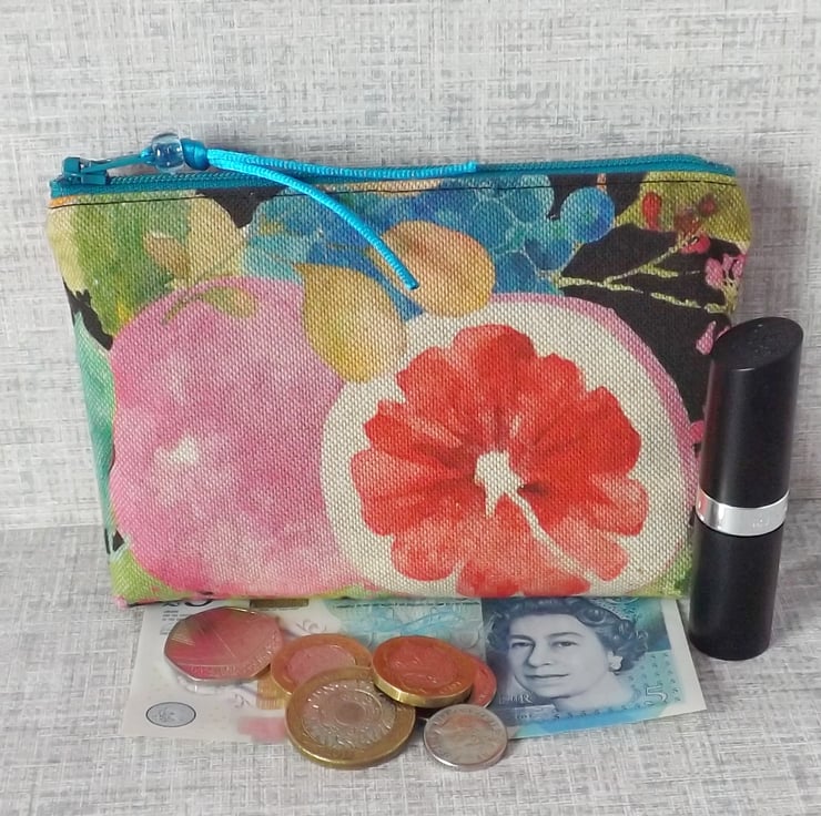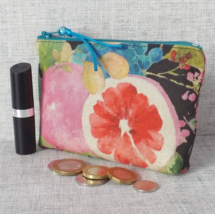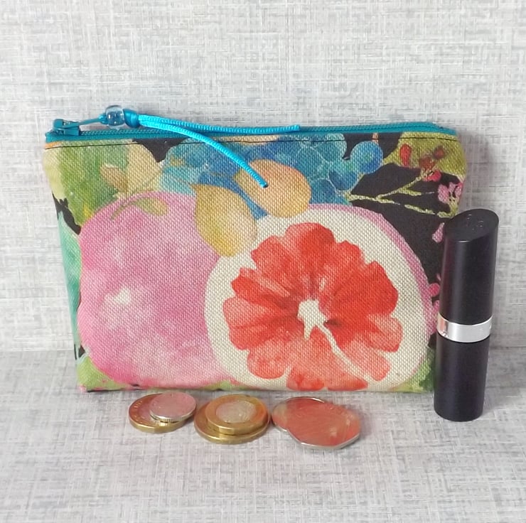 A large size coin purse made from a cotton mix canvas with a fruit & floral design in shades of pink, orange, blue & green on a black background