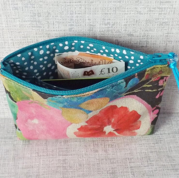 The lining is a greeny turquoise cotton fabric with white spots..There is a pocket inside for a credit/debit/store card or some notes.