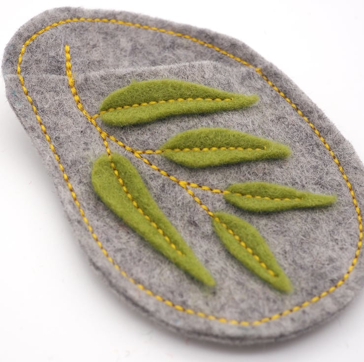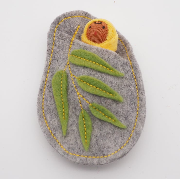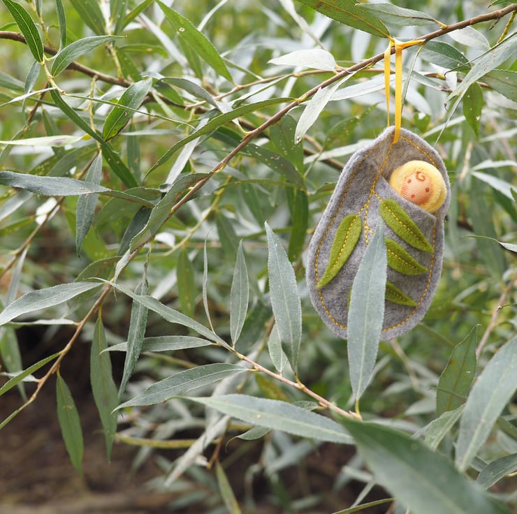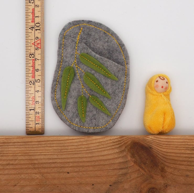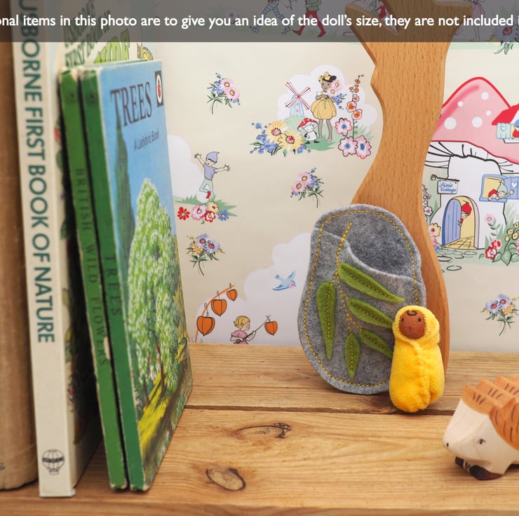 This little Itty Bitty Baby is safely nestled inside a 100% wool felt sleeping pod, appliqued with willow leaves. She comes out and is made from soft cotton velour. Her head is a wool ball, covered in skin coloured cotton interlock and with carefully hand drawn details.