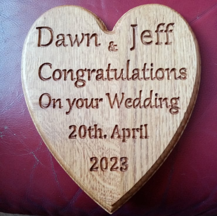 Heart shaped engraved congratulations on solid hardwood,Oak, Mahogany, Walnut, engraved in your own personal message. 200mm 230mm 18mm. Suitable for any celebration occasion. Send me your message and I will see how it looks on the space available. No obligation to purchase. Complete with fixing.