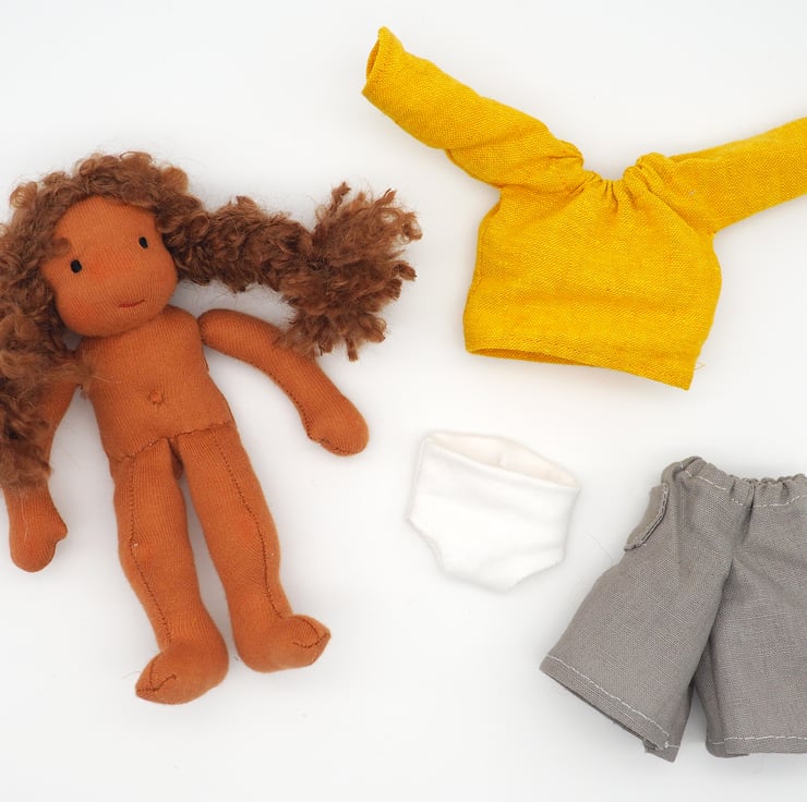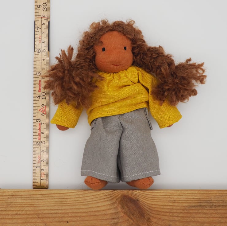 She is a small doll (around 20cm tall) - so can be taken everywhere on adventures and included in your child's games. She comes wearing grey trousers, a yellow top and cotton knickers.