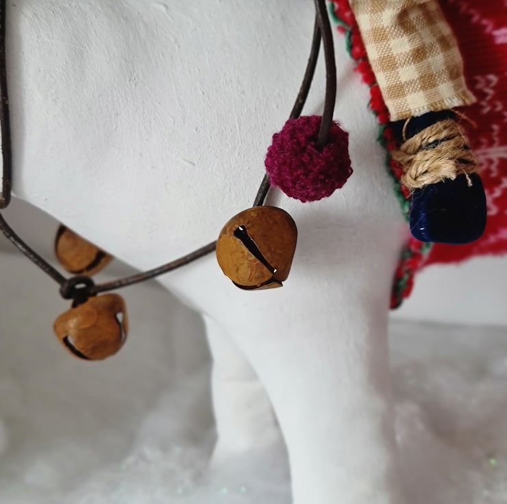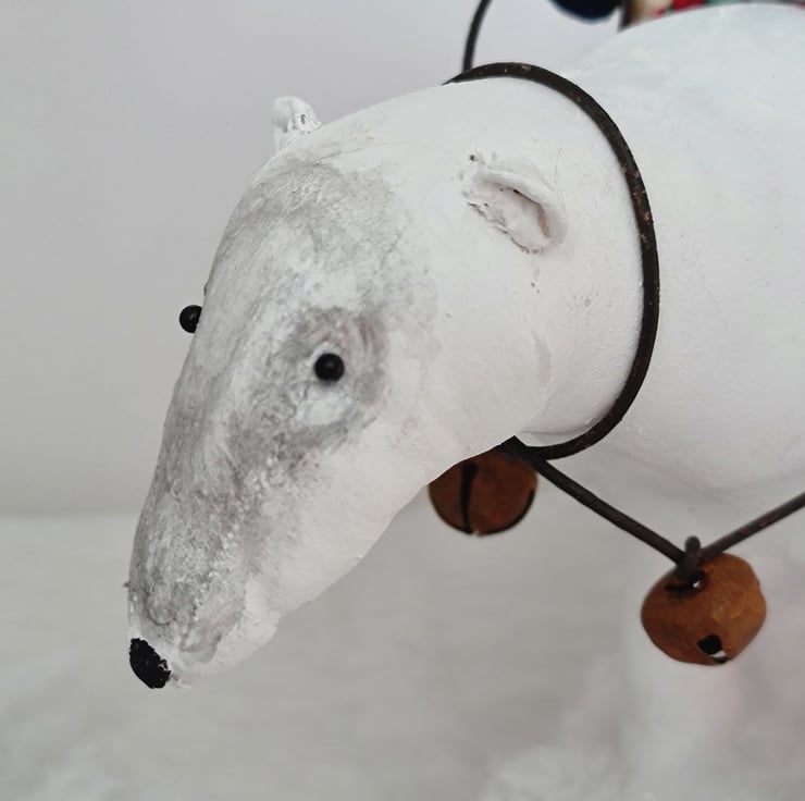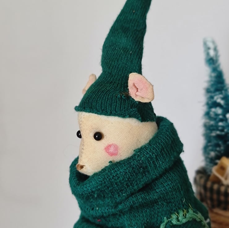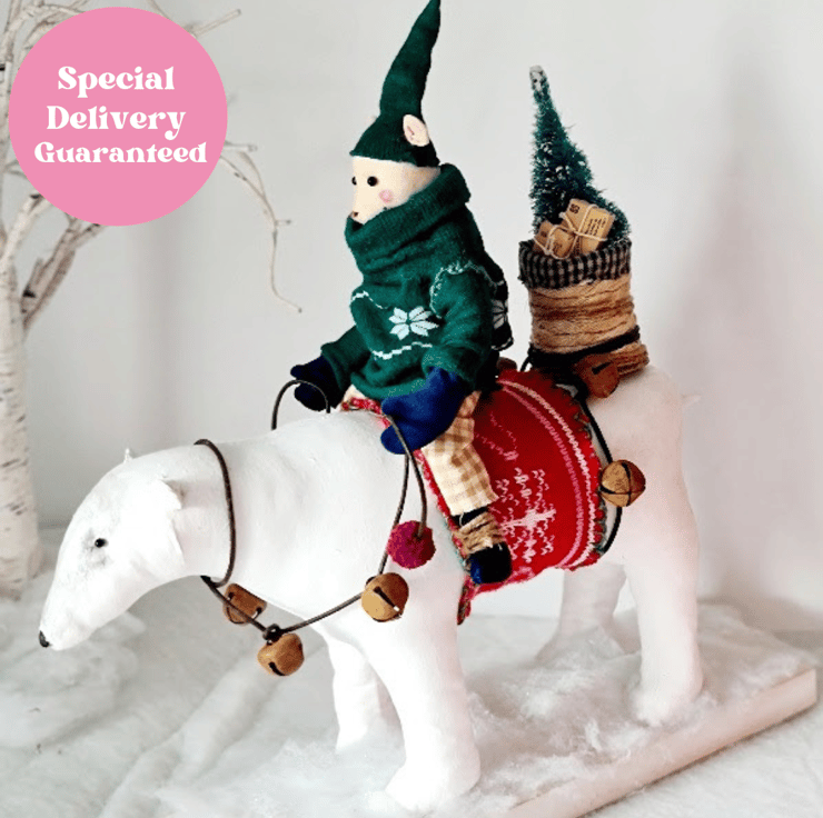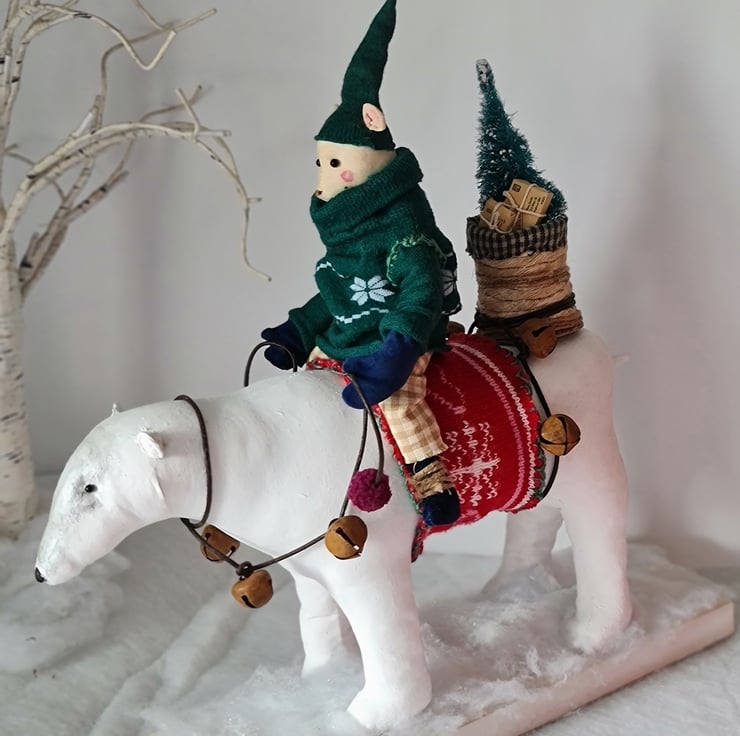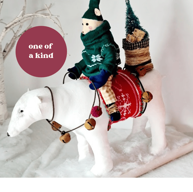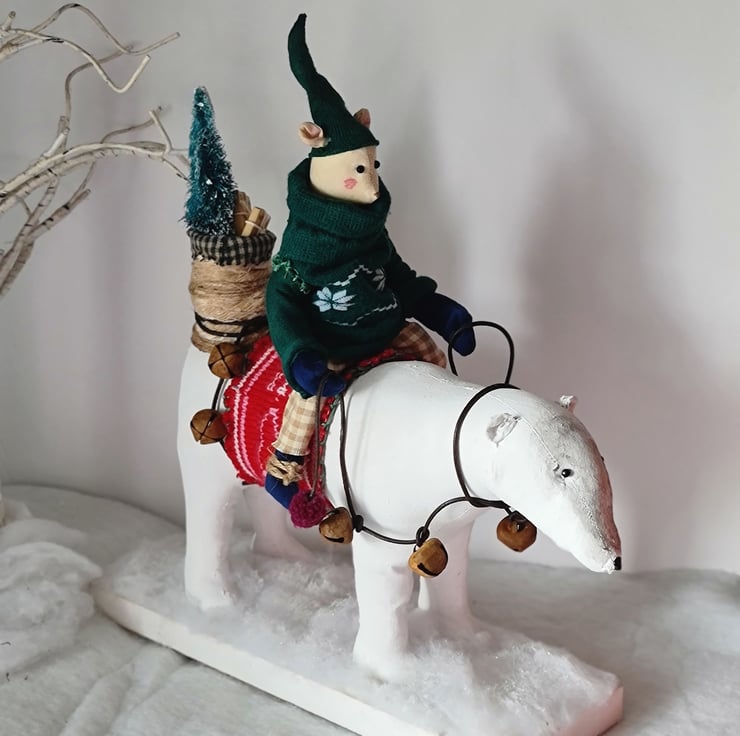 This one of a kind piece is hand and machine stitched in unbleached cotton. It is hand painted and stained. Mouse is wearing a deep green jumper and elf hat, cotton homespun trouses, midnight blue velvet gloves and boots. Polar bear has a leather harness and reins embellished with rusty bells and pom poms. On his back is a handmade basket, filled with a fir tree and parcels tied with string. The friends stand on a wooden plinth with sparkly snow.