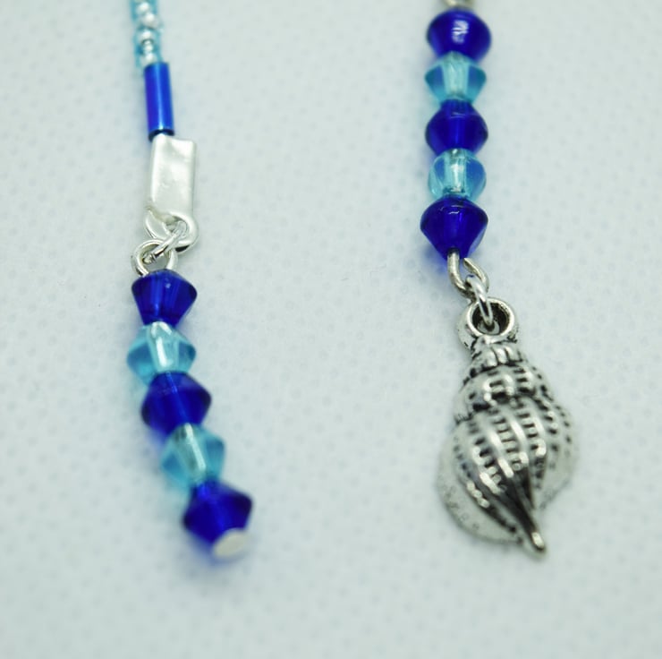 Handcrafted with beautiful silver lined pale blue glass seed beads and iridescent blue bugle beads reminiscent of the sea. At either end of the book thong there are glass bicone beads in turquoise and navy blue to match the body of the bookmark.