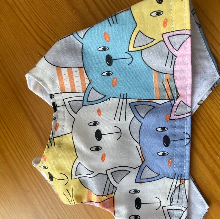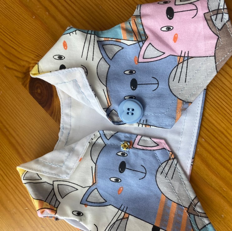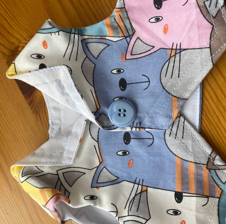 Medium size teddy bear waistcoat I this multi coloured really fun fabric, a must for cat lovers. Colours are bright. The waistcoat is lined in white, and closed with a button and snap fastener.