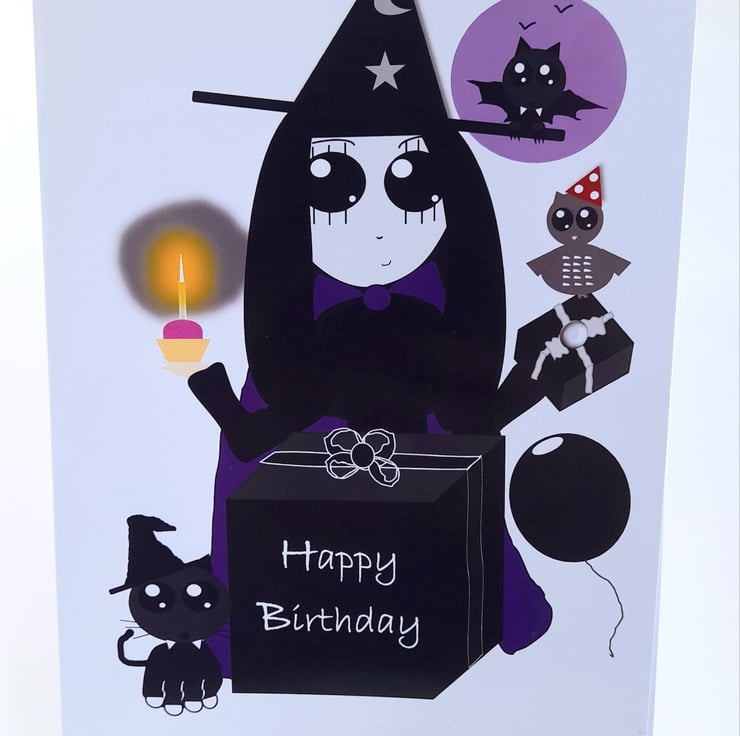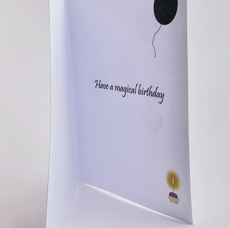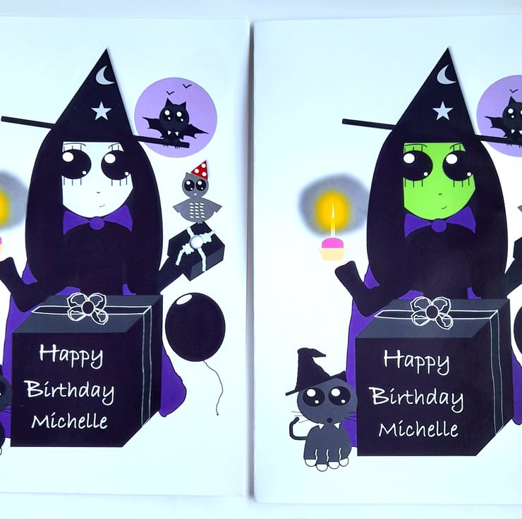 A cute witch birthday card, available in 2 colours & can be personalised up to 9 characters. Printed on 260gsm (see below) gloss card, 21cm x 29.7cm with inner 'Have a magical birthday' greeting. The card is sent with a white envelope & both card & envelope are fully recyclable.