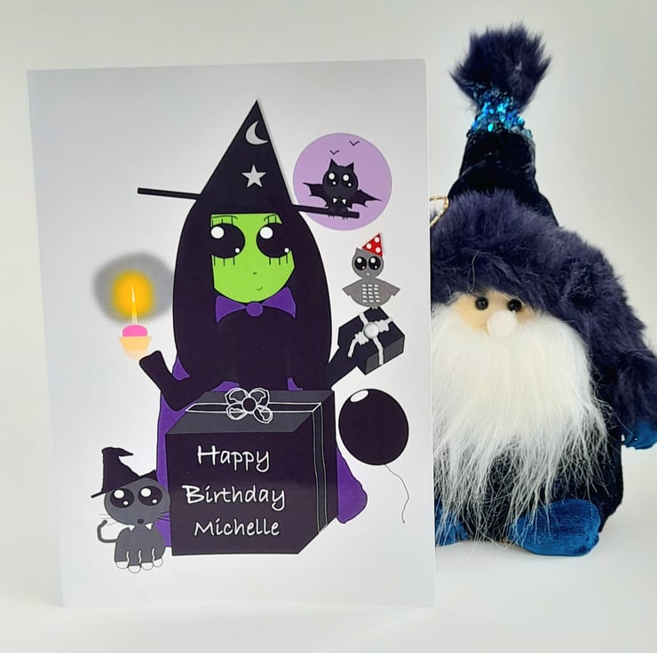 Please let me know the name & the colour you would like otherwise I will send the unpersonalised white witch card.